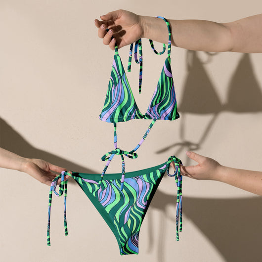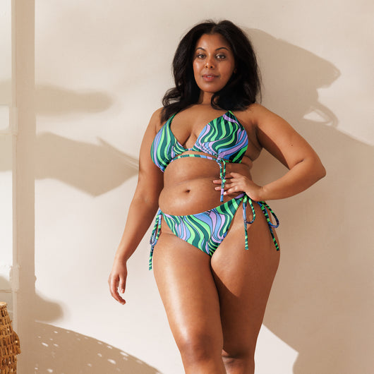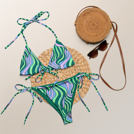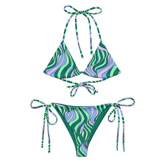 Stay comfortable and stylish all summer with this Shell Sonata Recycled String Bikini set, featuring vibrant sea wave print in green, blue and purple colors. Made from soft recycled polyester with double-layering and UPF 50+ protection, this floral bikini offers both comfort and sun safety. Available in sizes 2XS to 6XL, you can style the straps however you like and get ready to swim in this beautiful waves print swimwear.