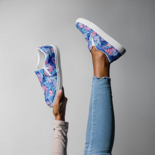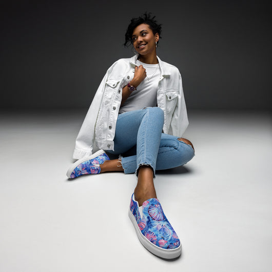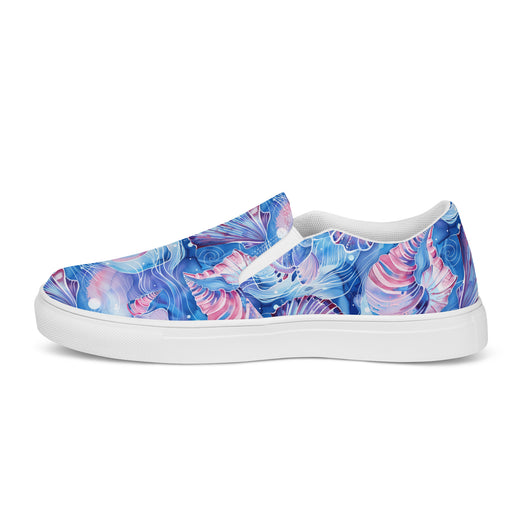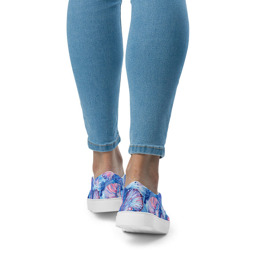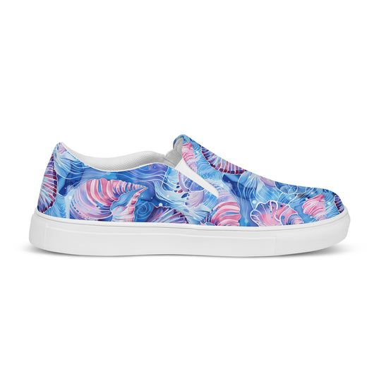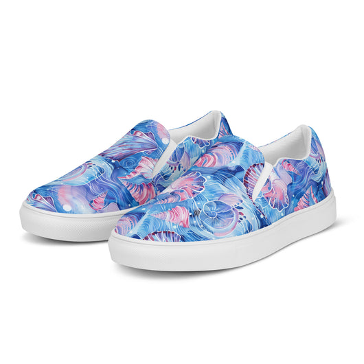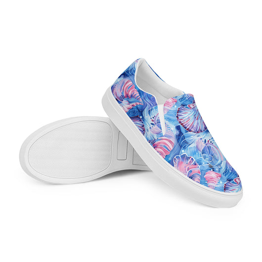 Step up your summer style with our unique rich blue printed canvas shoes, featuring a beautiful sea shell pattern. These women’s slip-ons are not only stylish but also incredibly comfy and convenient. Perfect for any outfit, these summer shoes offer soft, removable insoles for a customized fit and rubber outsoles for excellent traction. Enjoy the effortless ease of these printed canvas shoes—just slip them on and you’re ready to go!