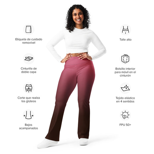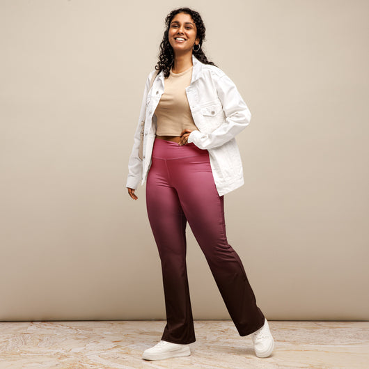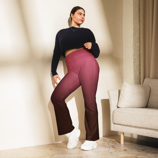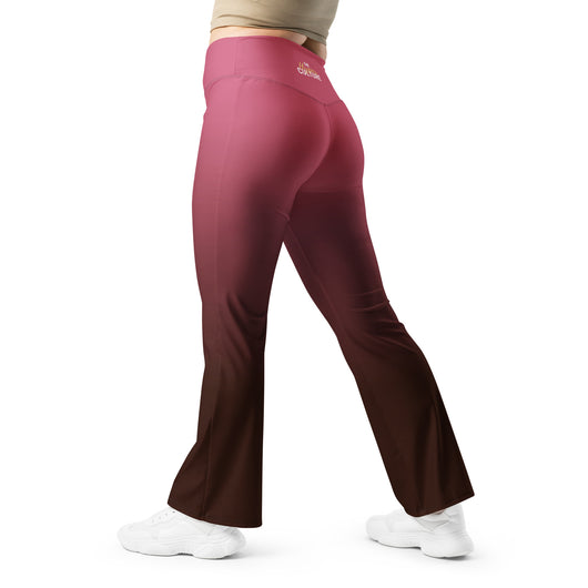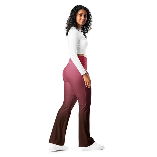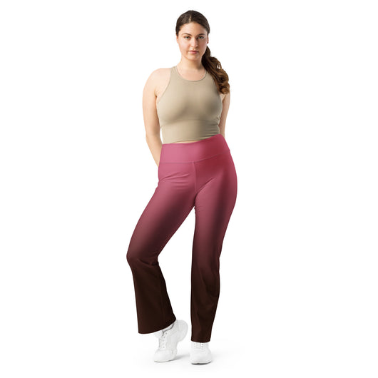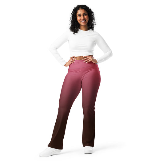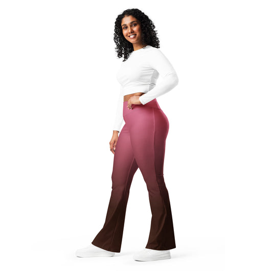 2XS - 6XL | Elevate your activewear with our flare leggings featuring a high waist and butt-lifting cut. Adorned with a gorgeous onion pink to coffee brown gradient, these trendy yoga leggings combine style and comfort with their flared leg bottoms. Perfect for the gym or casual wear, they’re a must-have addition to any wardrobe.