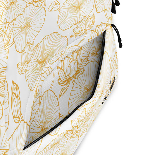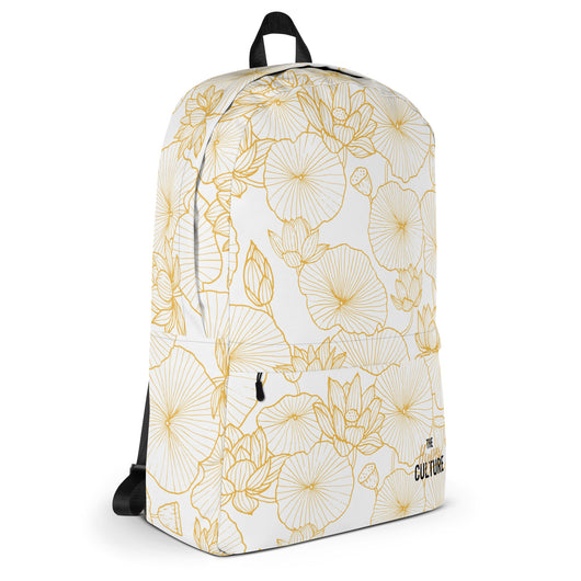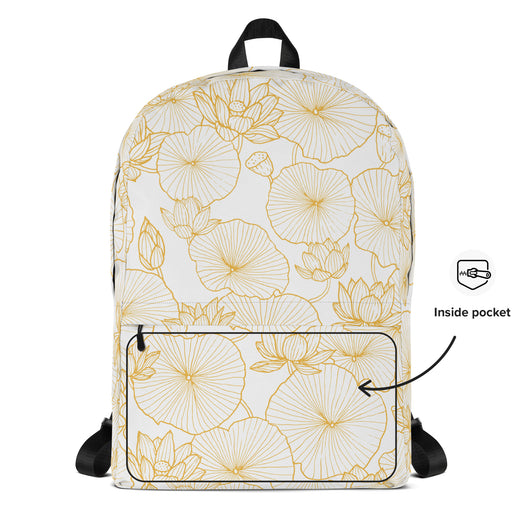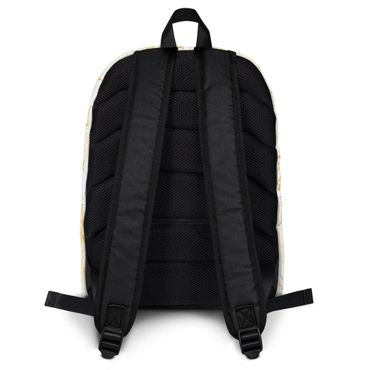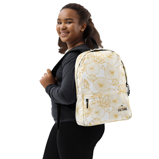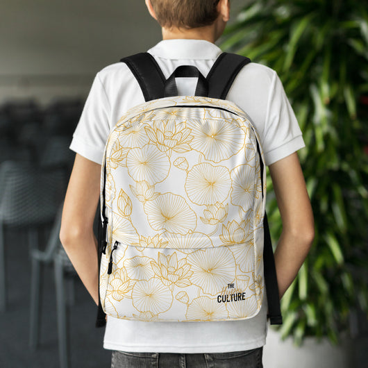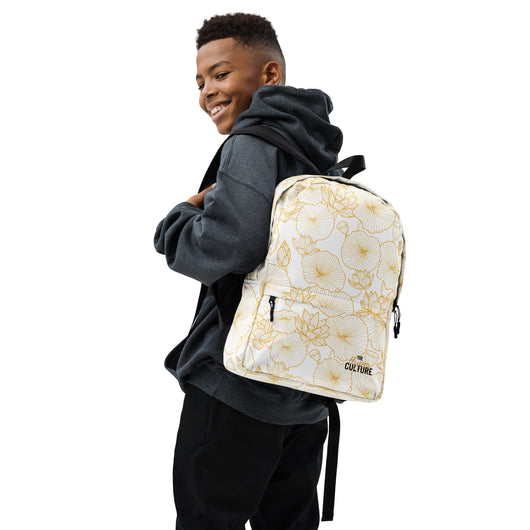 This medium-sized backpack is just what you need for daily use or sports activities! Adorned with stunning gold flower print on a white background, this stylish backpack is perfect for both adults and kids for school. With spacious pockets, including one for a 15" laptop, you'll have plenty of room for all your necessities. The water-resistant material ensures your belongings stay protected from the weather. Stay organized and stylish with this gold flower print backpack!