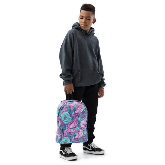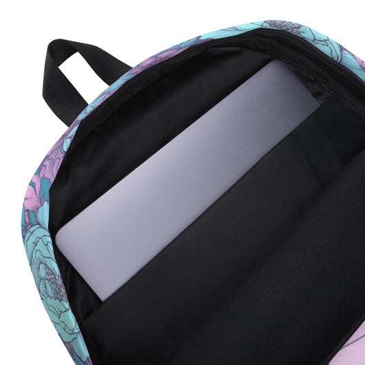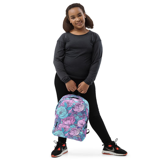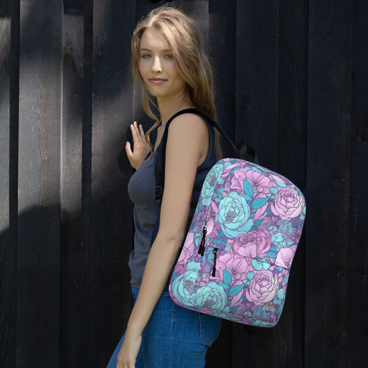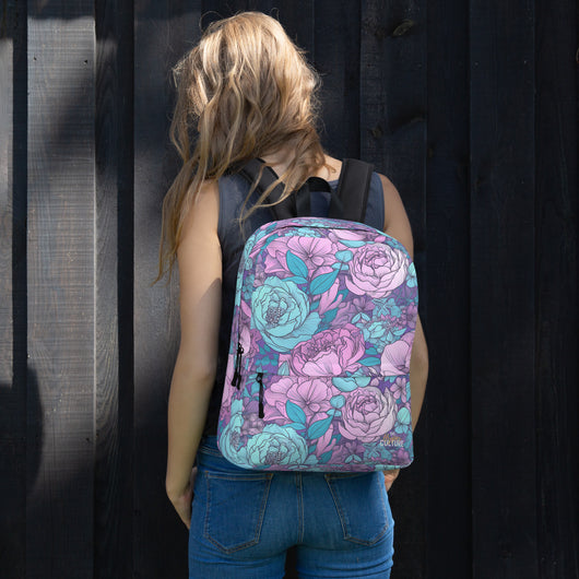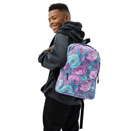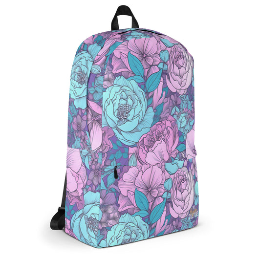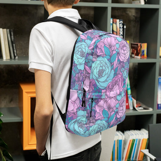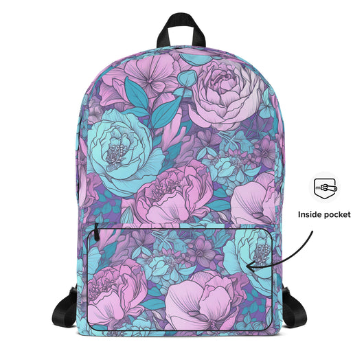 16â…ž" (42cm) x 12ÂĽ" (31cm), x 3â…ž" (10cm) | This medium-sized backpack, perfect for daily use or sports, is adorned with a gorgeous pastel purple, blue and pink floral print. Ideal for school, it has spacious pockets, fits a 15" laptop, and is water-resistant to protect belongings.