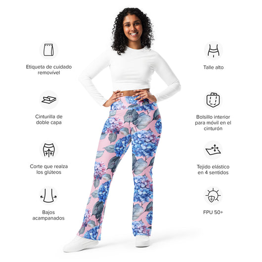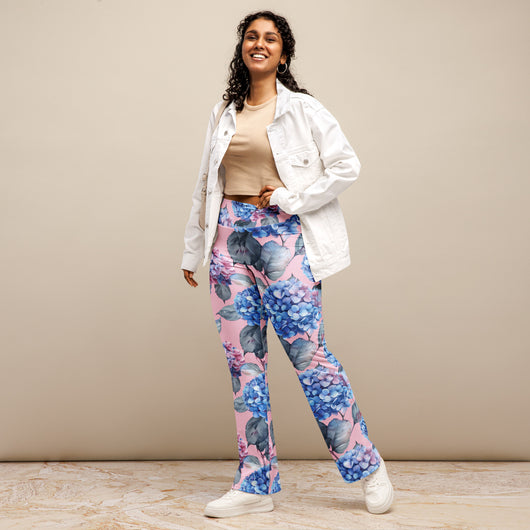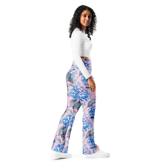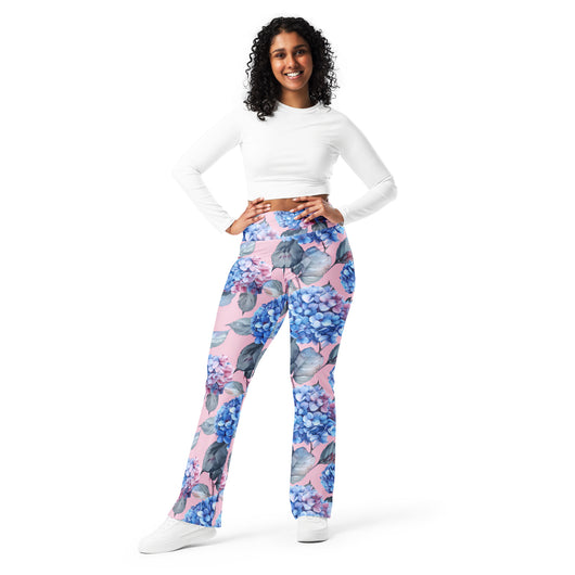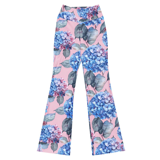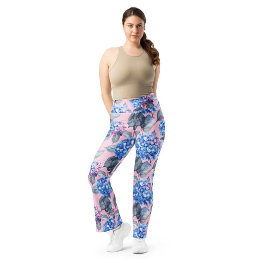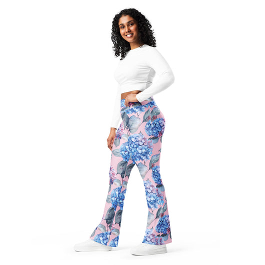 Enhance your figure with our flare yoga leggings, featuring a high waist and butt-lifting cut. These trendy leggings, adorned with a gorgeous blue Hydrangea flowers on a pale pink background, offer both style and comfort with their flared leg bottoms. Perfect for a walk, gym session, or styled with a bomber jacket or hoodie. Available in sizes 2XS to 6XL, these floral print flare leggings are a must-have for any wardrobe. Elevate your activewear with these standout yoga leggings.