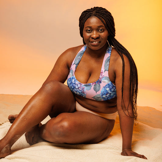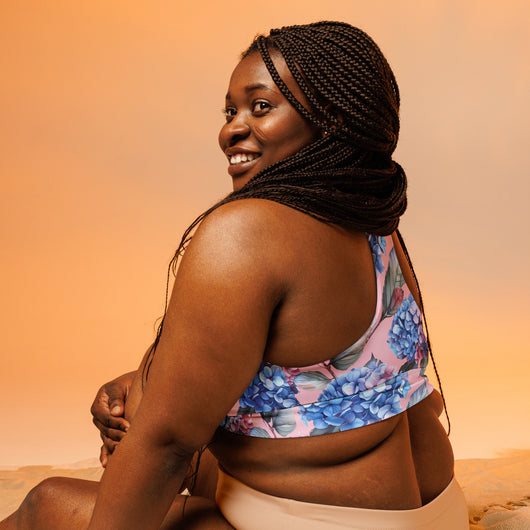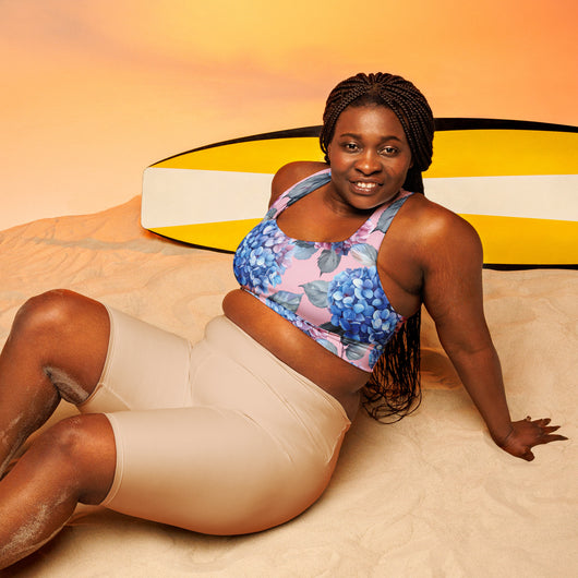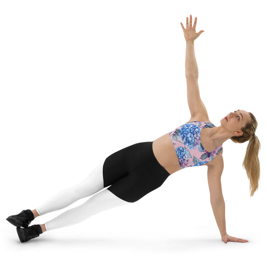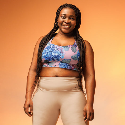 This sports bra is the perfect workout top for exercising. The compression fabric, combined with a double-layered front and shoulder straps, ensures great support while running, jumping, or lifting weights. Adorned with a gorgeous blue Hydrangea flowers on a pale pink background, itās stylish enough to wear as streetwear on sunny days. Available in sizes XS to 3XL.