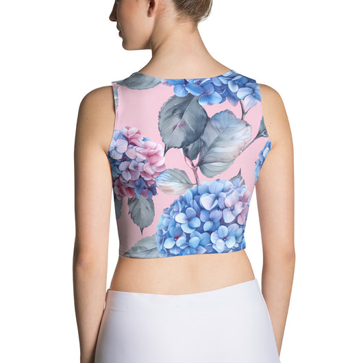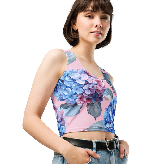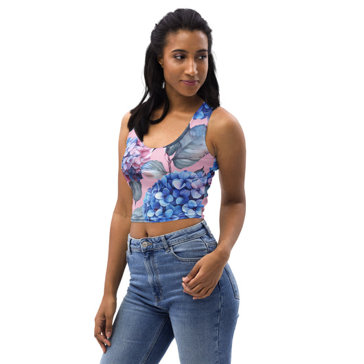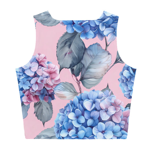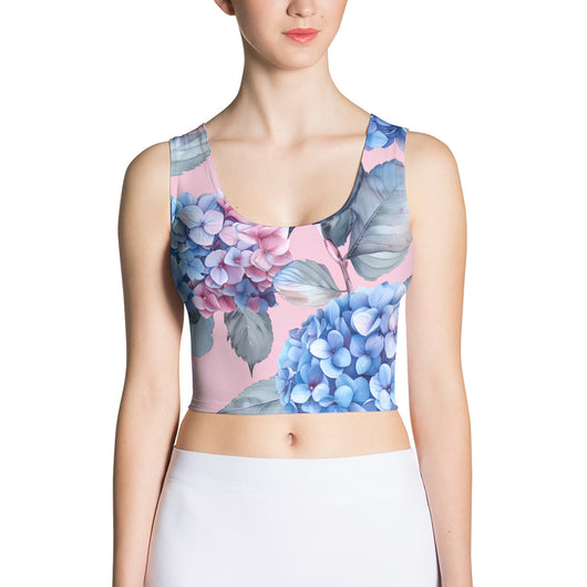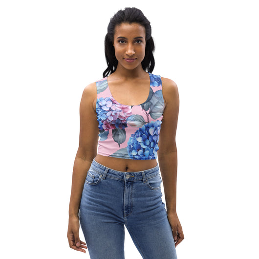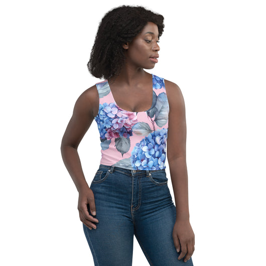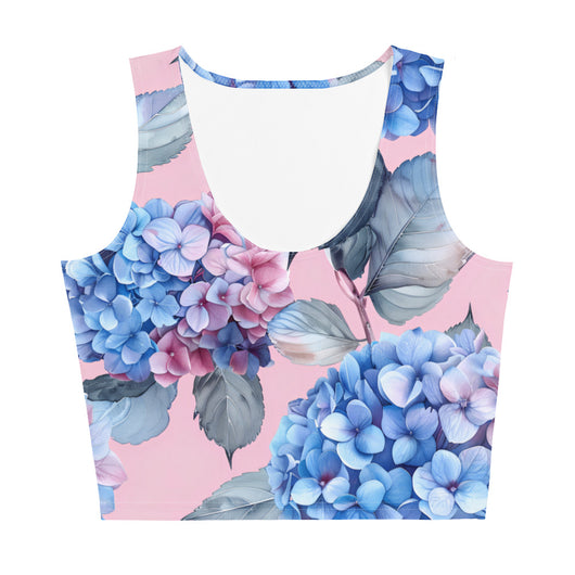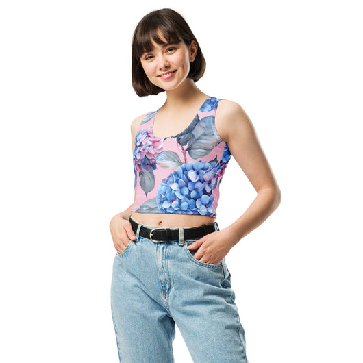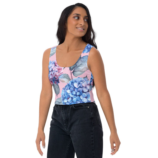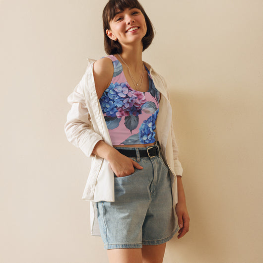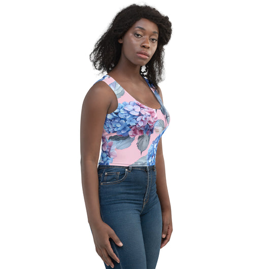 Slay all day in this all-over printed, body-hugging crop top! The Blushing Hydrangea crop top features a gorgeous blue Hydrangea flowers on a pale pink background. It's the ultimate sleeveless crop top to add some serious vibes to your wardrobe. Perfect for any look, this printed crop top is a must-have.