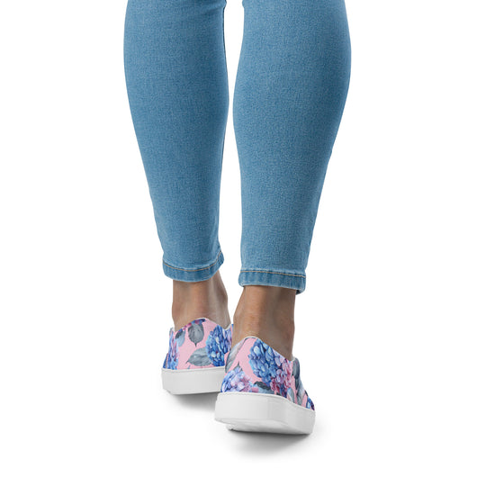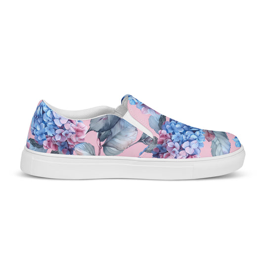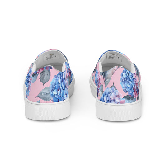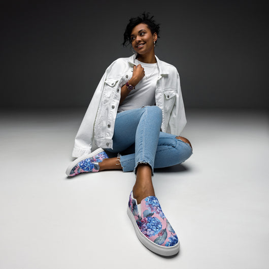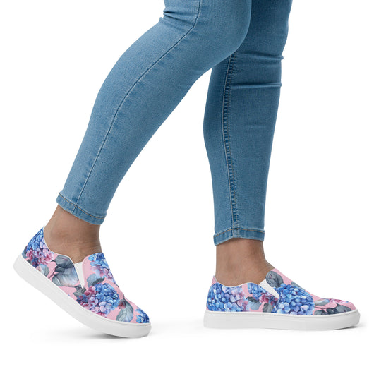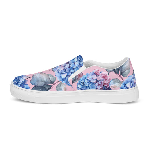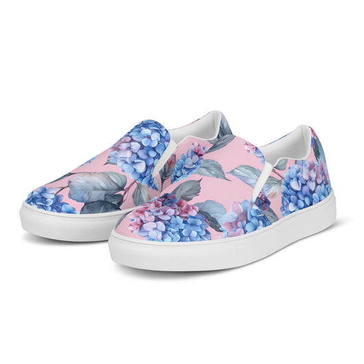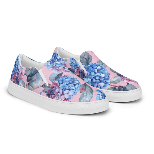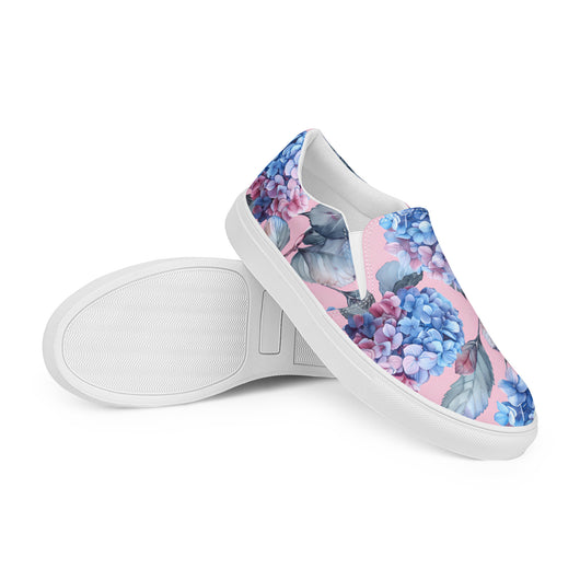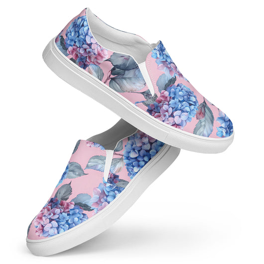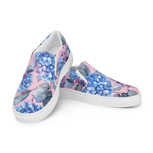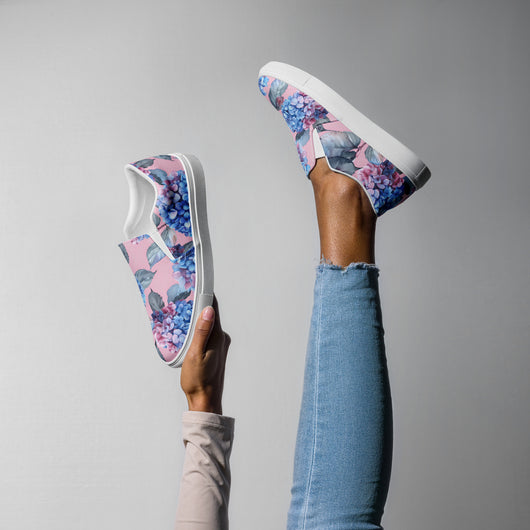 Step up your summer style with our unique rich pink pattern printed canvas shoes, featuring a gorgeous blue Hydrangea flowers on a pale pink background. These women’s slip-ons are not only stylish but also incredibly comfy and convenient. Perfect for any outfit, these summer shoes offer soft, removable insoles for a customized fit and rubber outsoles for excellent traction. Enjoy the effortless ease of these beautiful floral print canvas shoes—just slip them on and you’re ready to go!