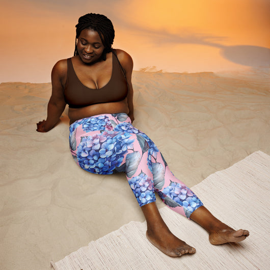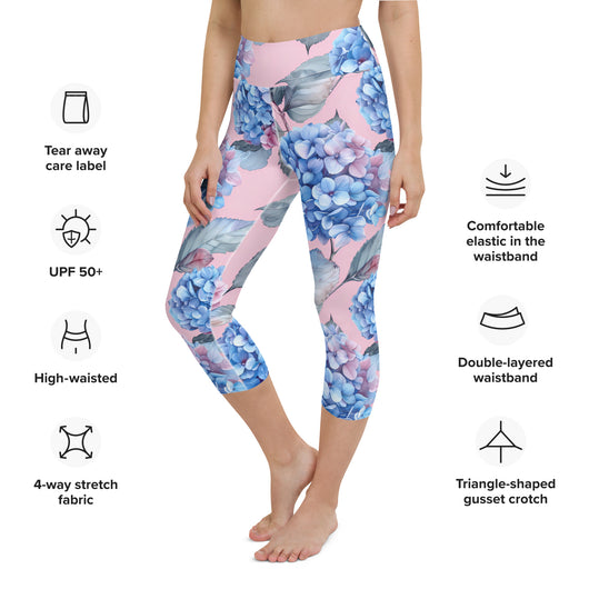These yoga capri leggings rock a high elastic waistband, perfect for yoga, gym workouts, or chill evenings at home. With a gorgeous blue Hydrangea flowers on a pale pink background, they blend comfort with trendy style effortlessly.