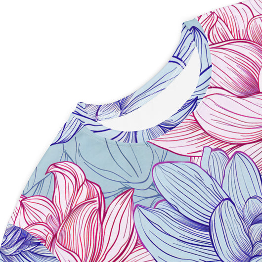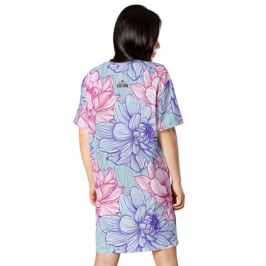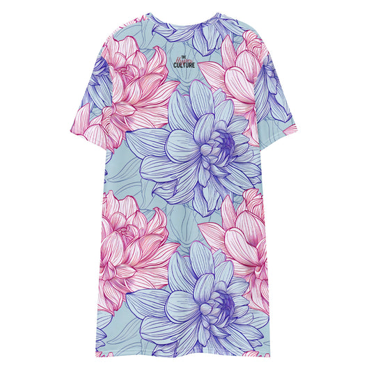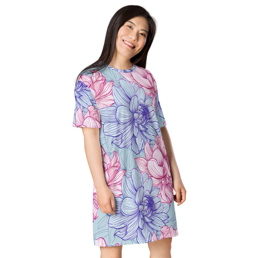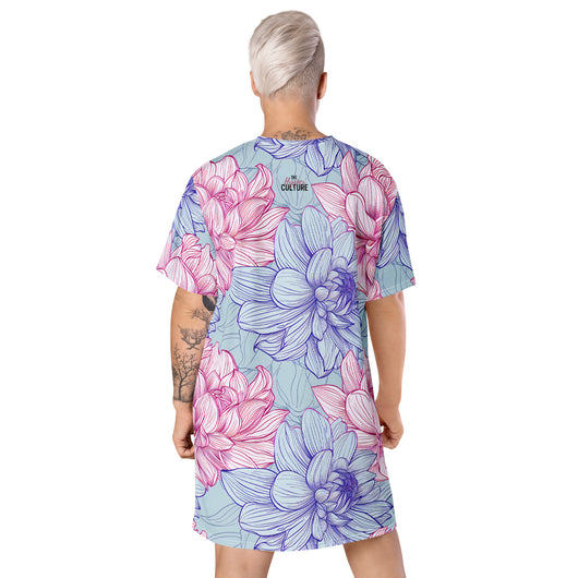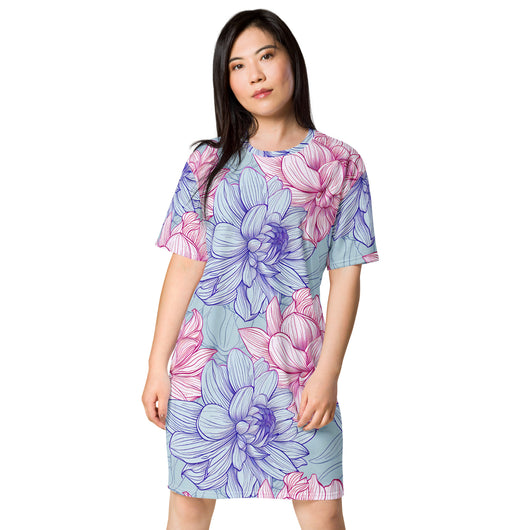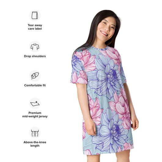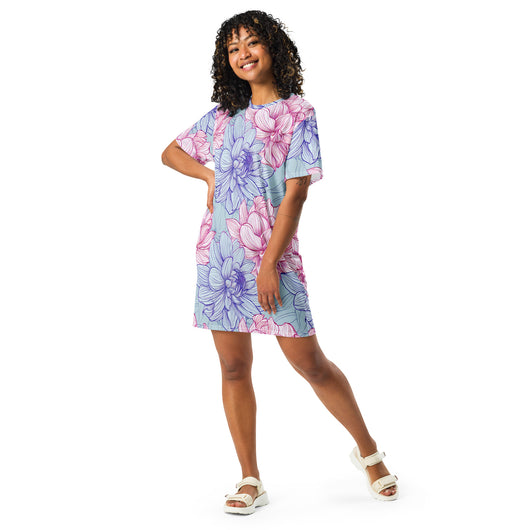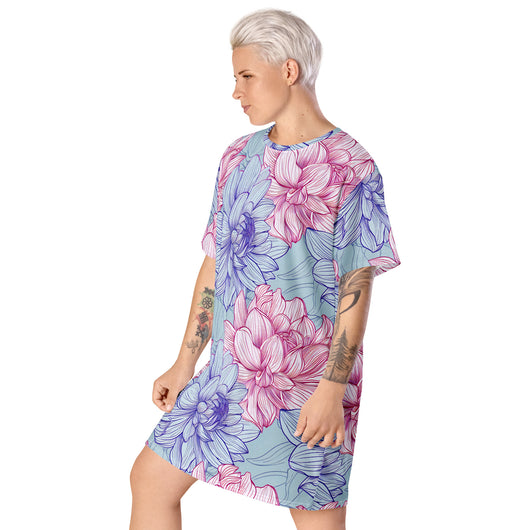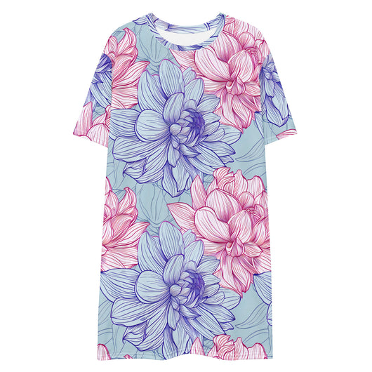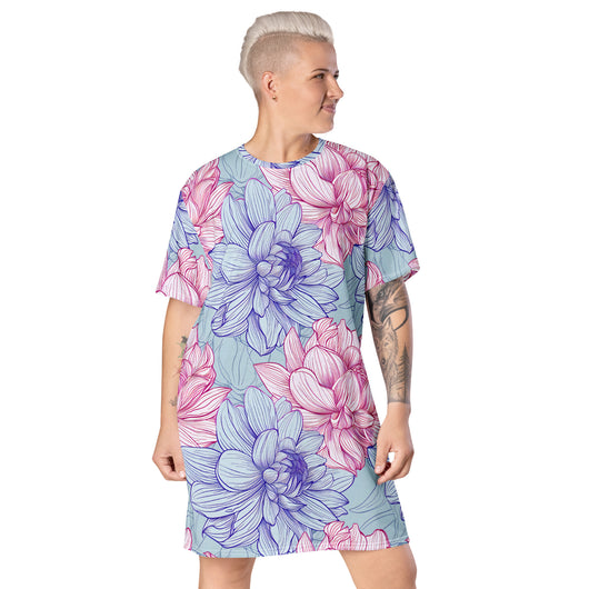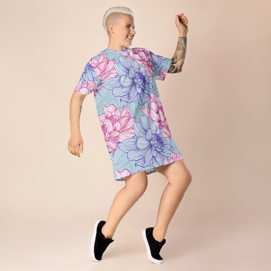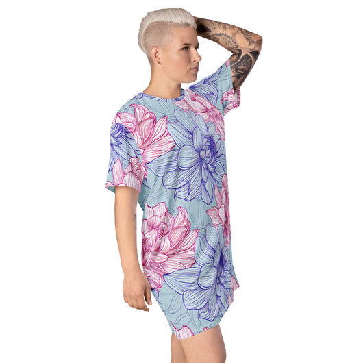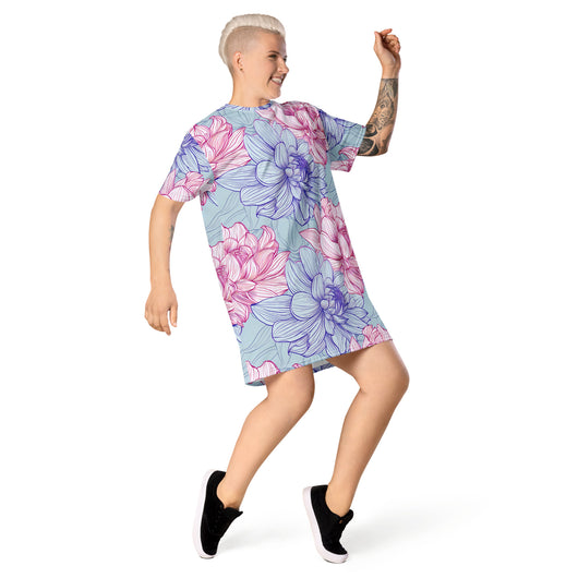2XS - 6XL | Step into style with this gorgeous dahlia floral print on grey background. Perfect for sneakers or heels, this versatile oversized t-shirt dress lets you create a unique look. Shine and make a statement wherever you go!