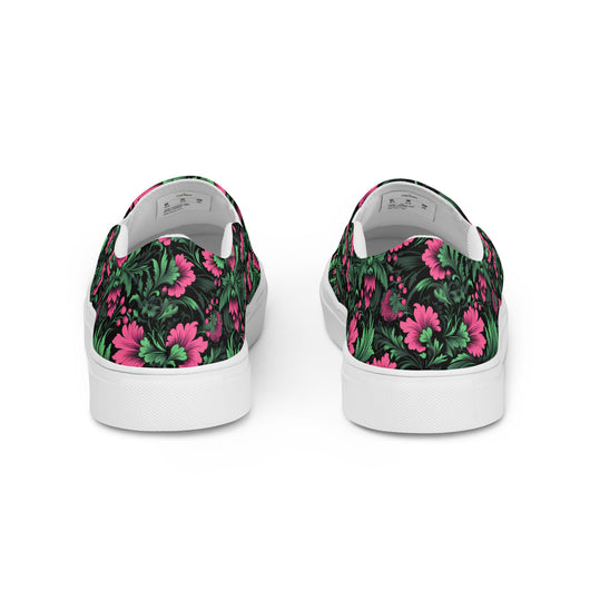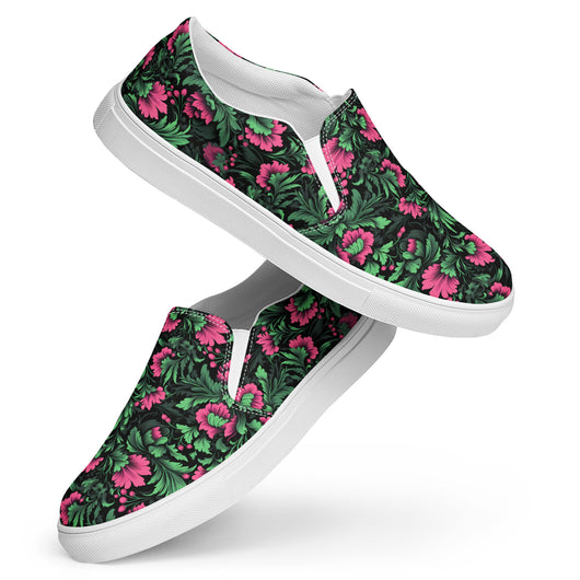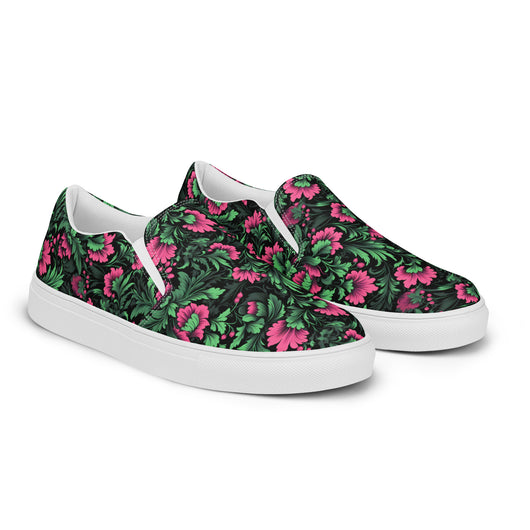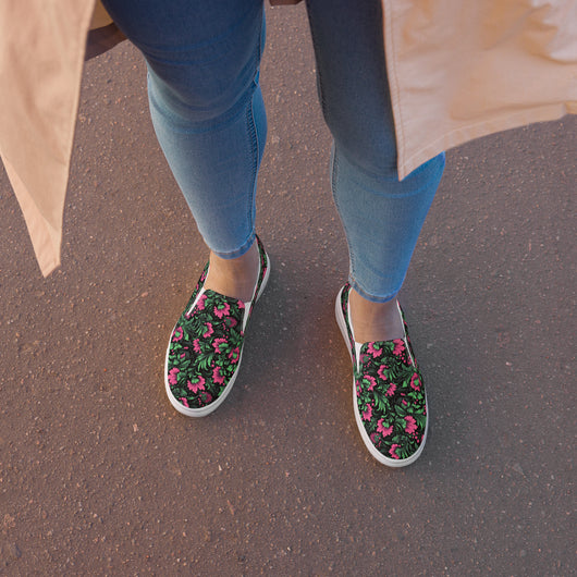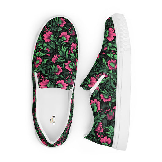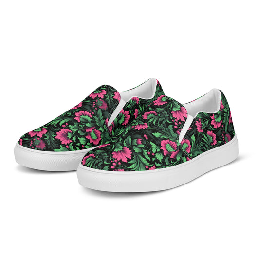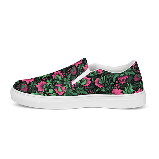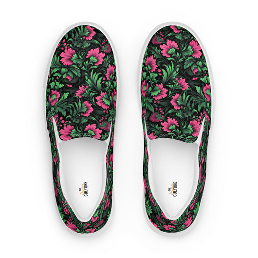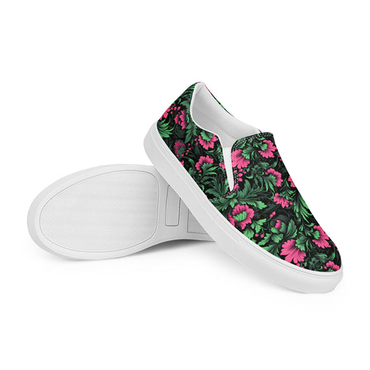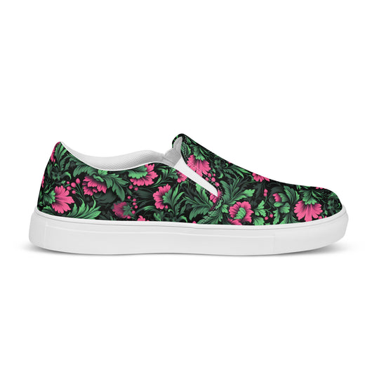 Step up your summer style with our unique rich floral printed canvas shoes, featuring a beautiful pink floral prints in green background. These women’s slip-ons are not only stylish but also incredibly comfy and convenient. Perfect for any outfit, these summer shoes offer soft, removable insoles for a customized fit and rubber outsoles for excellent traction. Enjoy the effortless ease of these printed canvas shoes—just slip them on and you’re ready to go!