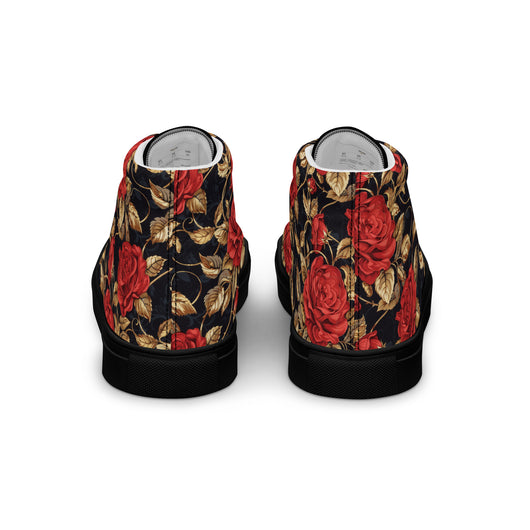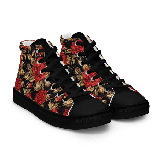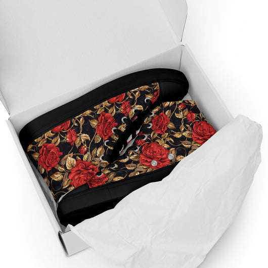 Adding a pair of classic and stylish high top canvas shoes to your wardrobe would be a fantastic choice. A gorgeous crimson red gothic roses on black background to suit your style!