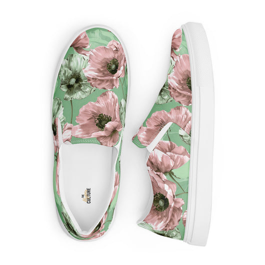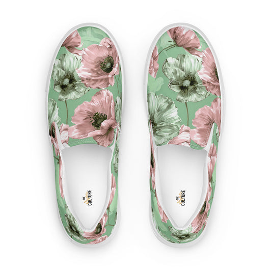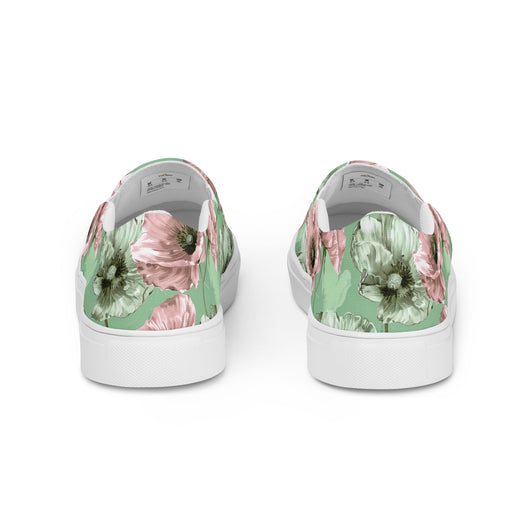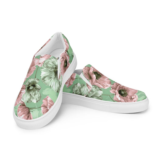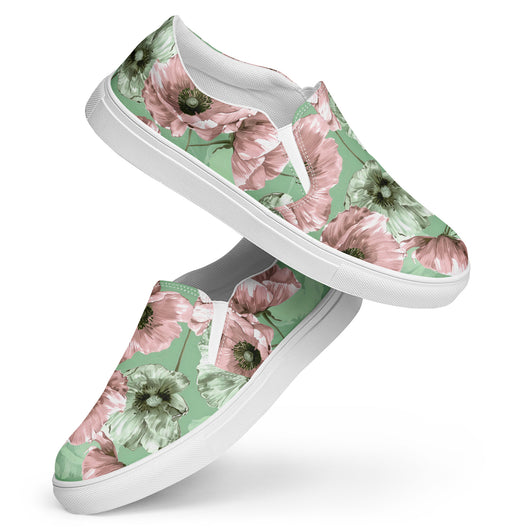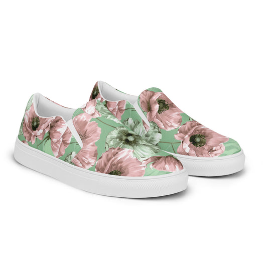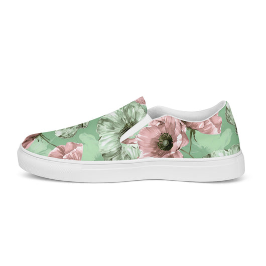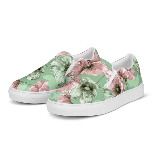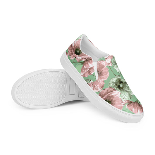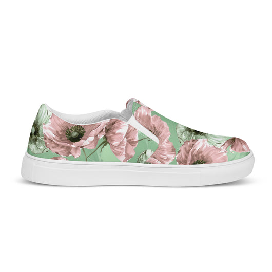 Step up your summer style with our unique pastel floral pattern printed canvas shoes, featuring a pale green and pink poppy flowers on a pastel green background. These women’s slip-ons are not only stylish but also incredibly comfy and convenient. Perfect for any outfit, these summer shoes offer soft, removable insoles for a customized fit and rubber outsoles for excellent traction. Enjoy the effortless ease of these printed canvas shoes—just slip them on and you’re ready to go!