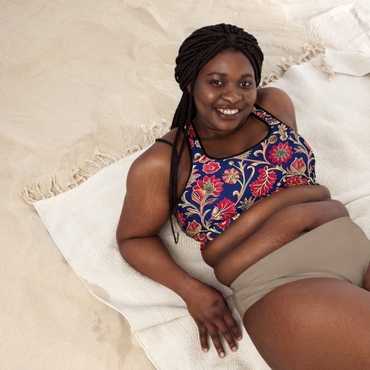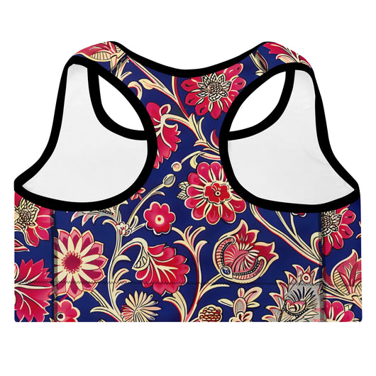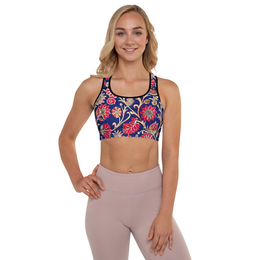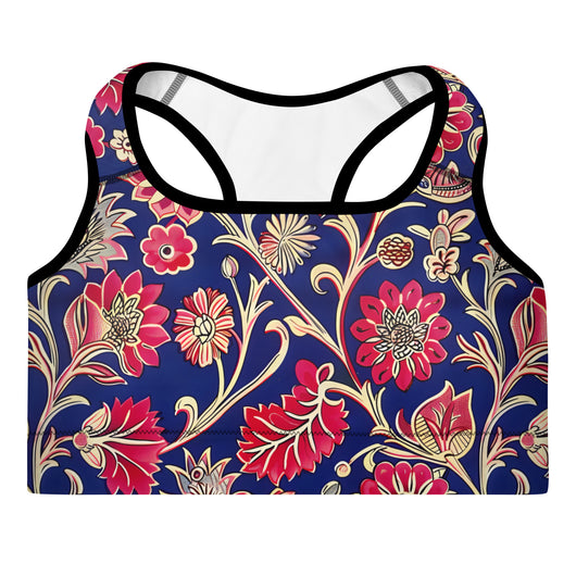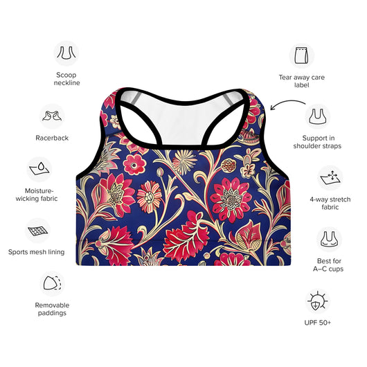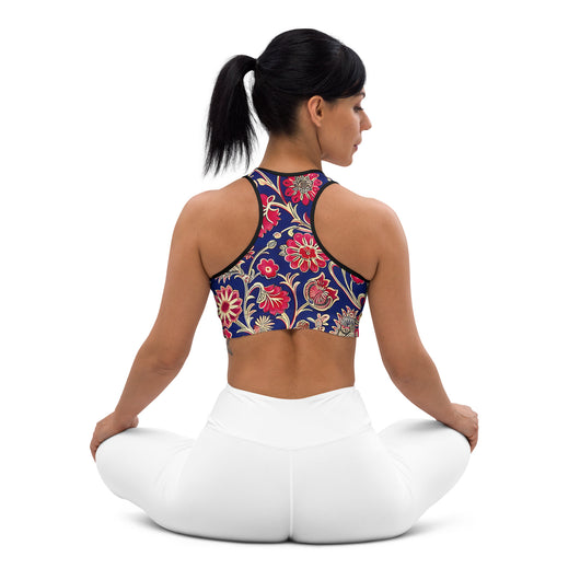 Discover the perfect sports bra for your workouts! This comfy bra, available in sizes XS to 2XL, features soft, moisture-wicking fabric, extra material in the shoulder straps, and removable padding for maximum support. Adorned with a gorgeous red ethnic floral print on a dark blue background, it combines style and functionality seamlessly.