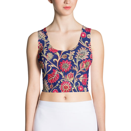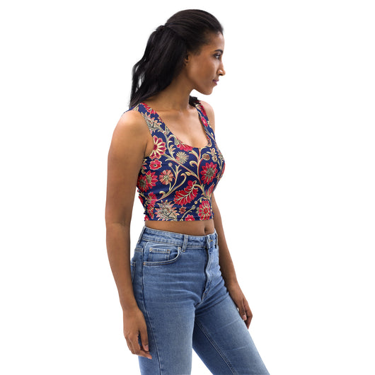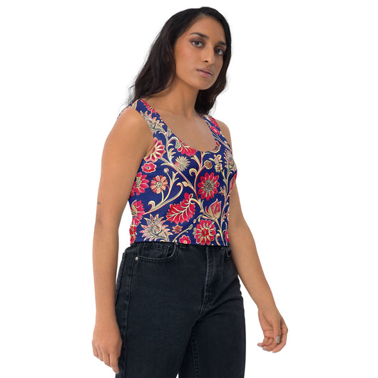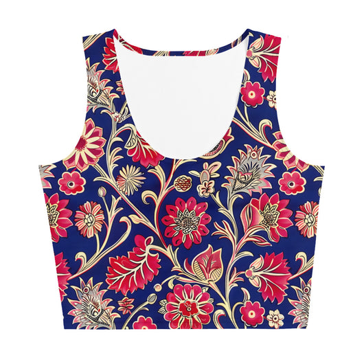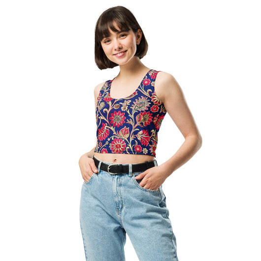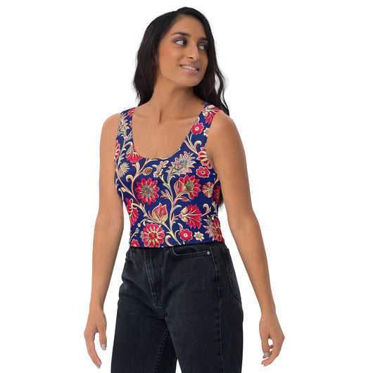 Slay all day in this all-over printed, body-hugging crop top! The Black Maze crop top features a gorgeous red ethnic florals on a dark blue background. It's the ultimate sleeveless crop top to add some serious vibes to your wardrobe. Perfect for any look, this printed crop top is a must-have.