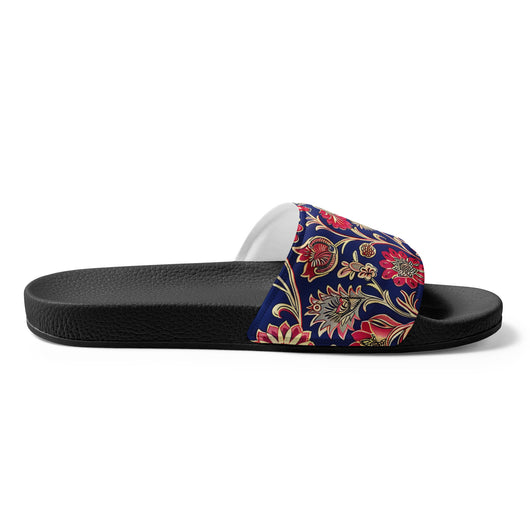 These women’s slides are a summer essential. With a cushioned upper strap and textured footbed, they keep you comfy all day long—whether you’re hitting the beach or chilling by the pool. Featuring gorgeous red ethnic florals on dark blue background, they’re as stylish as they are comfy.