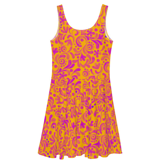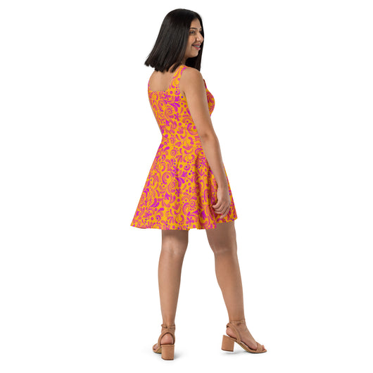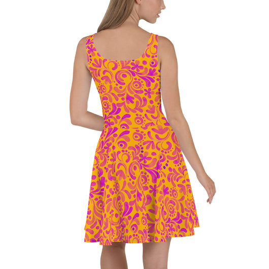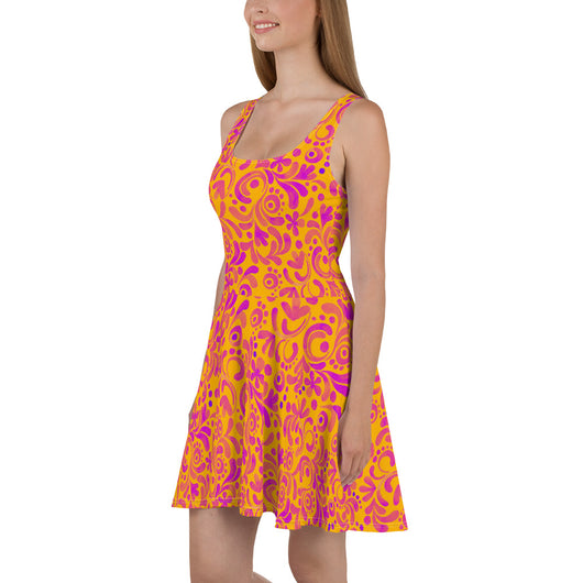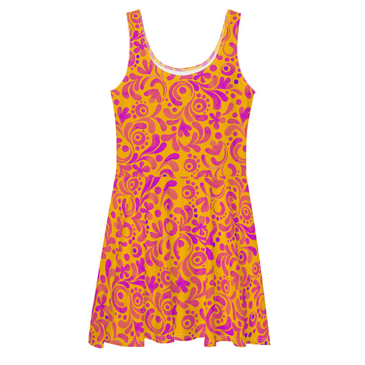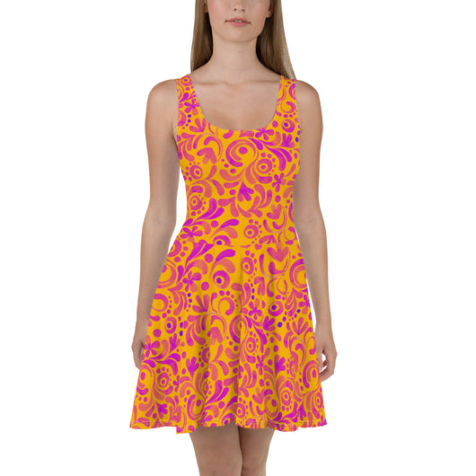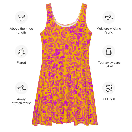 Dress to impress with this sleeveless yellow skater dress, adorned with beautiful pink floral strokes. The soft fabric and flared skirt provide an elegant twist, showcasing the intricate design in vibrant detail. Perfect for summer, this stunning dress is available in sizes XS to 3XL. Elevate your wardrobe with this must-have summer dress.