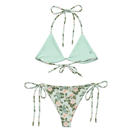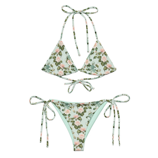 Stay comfortable and stylish all summer with this Vintage Flora Print Recycled String Bikini set, featuring a gorgeous vintage print with soft pink camellias and baby blue hydrangeas on pale bluish-green background. Made from soft recycled polyester with double-layering and UPF 50+ protection, this floral bikini offers both comfort and sun safety. Available in sizes 2XS to 6XL, you can style the straps however you like and get ready to swim in this beautiful floral print swimwear.