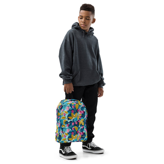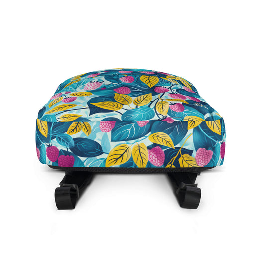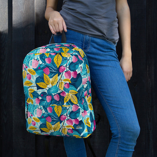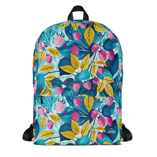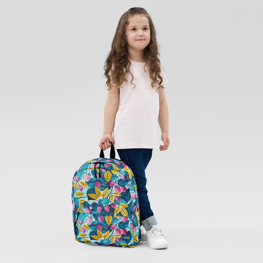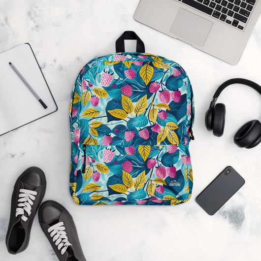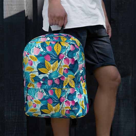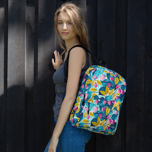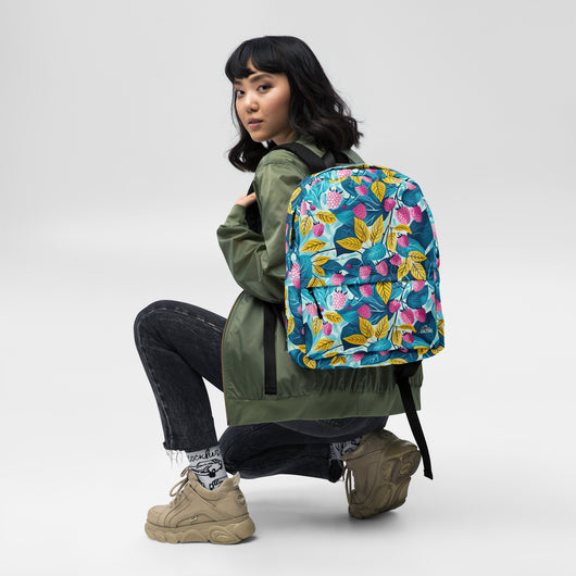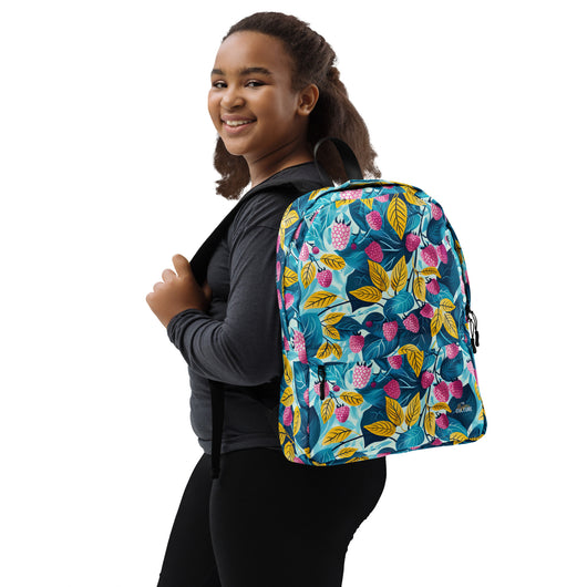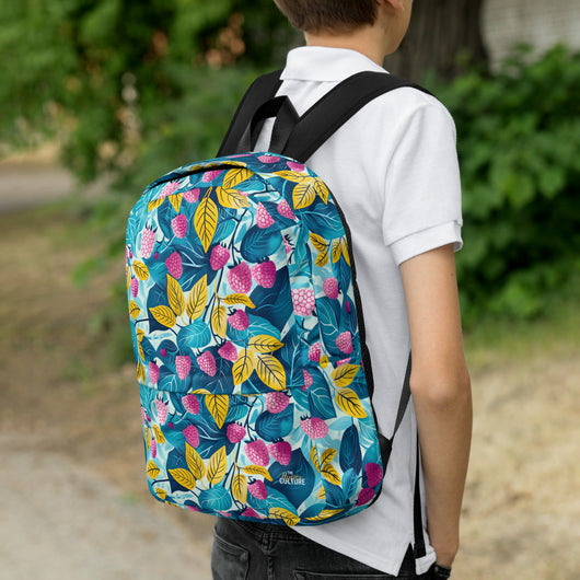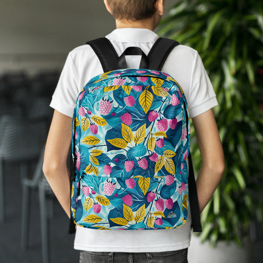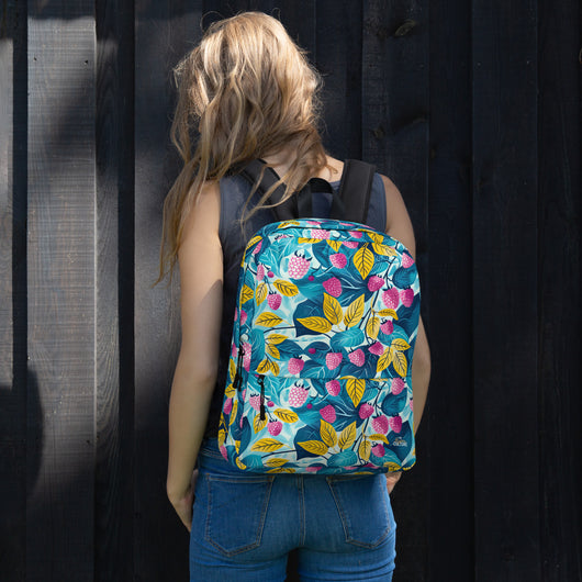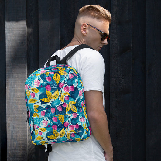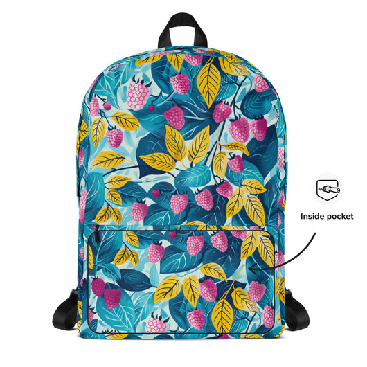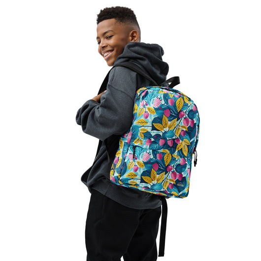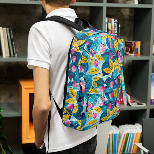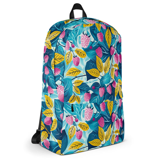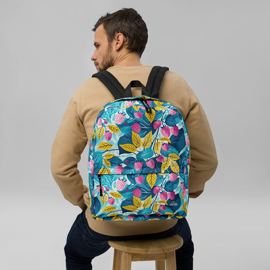 16â…ž" (42cm) x 12ÂĽ" (31cm), x 3â…ž" (10cm) | This medium-sized backpack, perfect for daily use or sports, is adorned with fruity raspberries with leaves on blue background. Ideal for school, it has spacious pockets, fits a 15" laptop, and is water-resistant to protect belongings.
