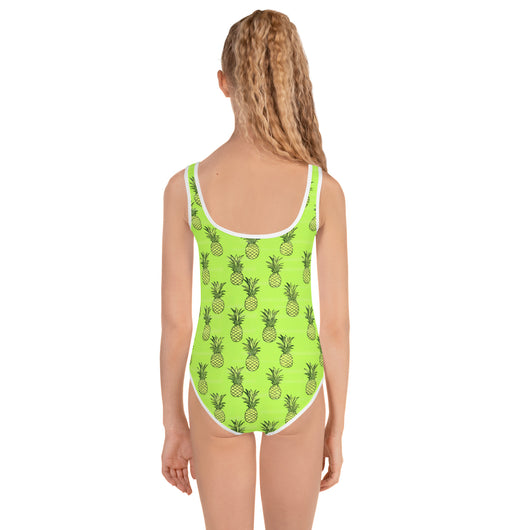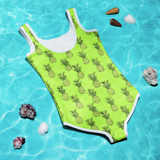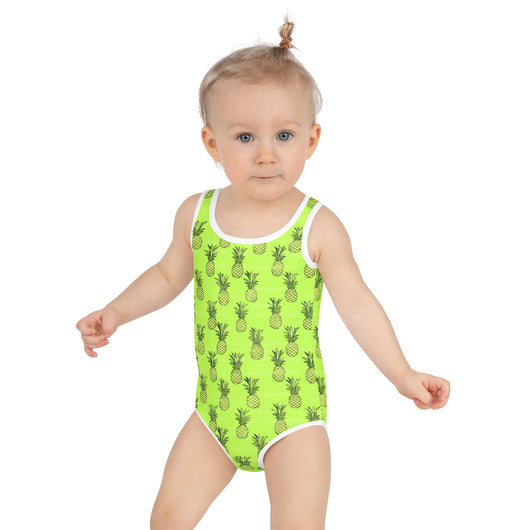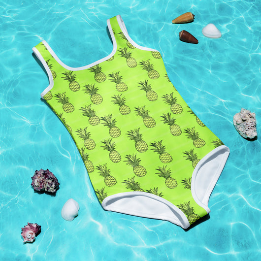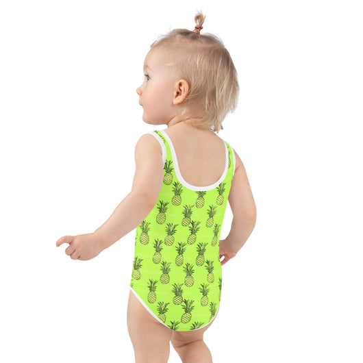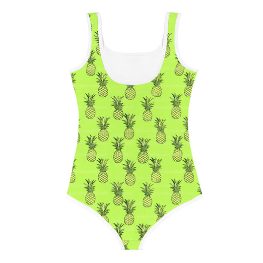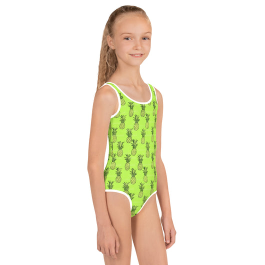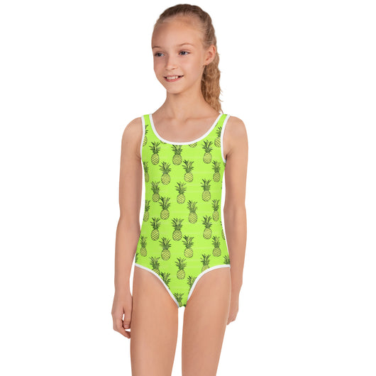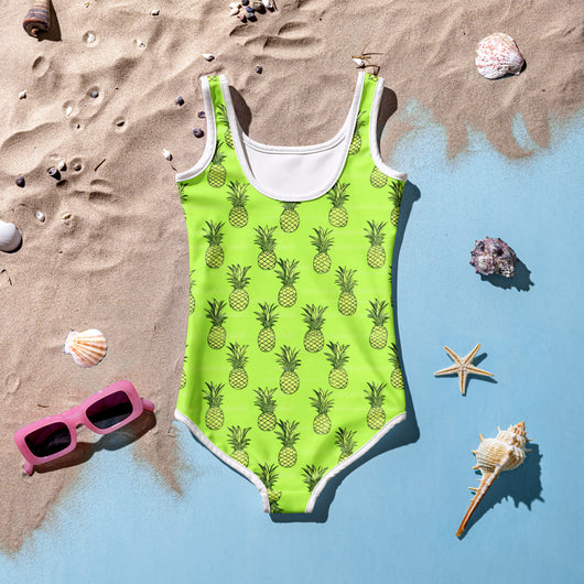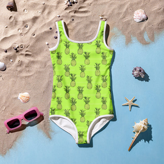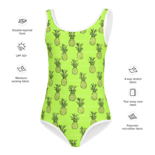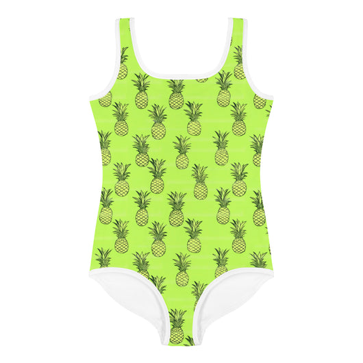 Make a splash with this girls' swimsuit! Featuring a fun pineapple print on a neon green background, it’s got all the vibes. Comfy fit, stretchy fabric, and fade-resistant colors keep it fresh. With a double-layered front, bias binding, and 38–40 UPF, it's perfect for active kids and worry-free parents. Dive in!