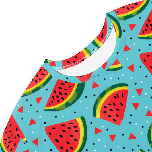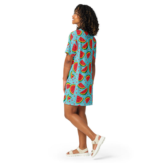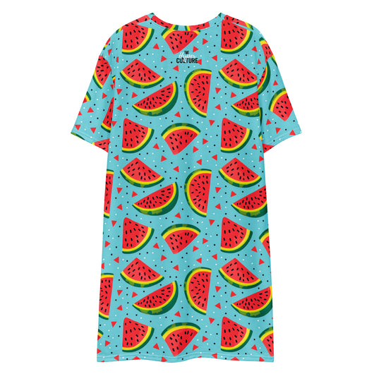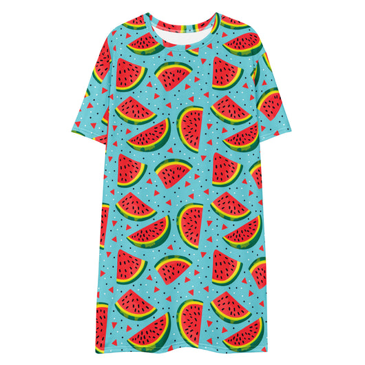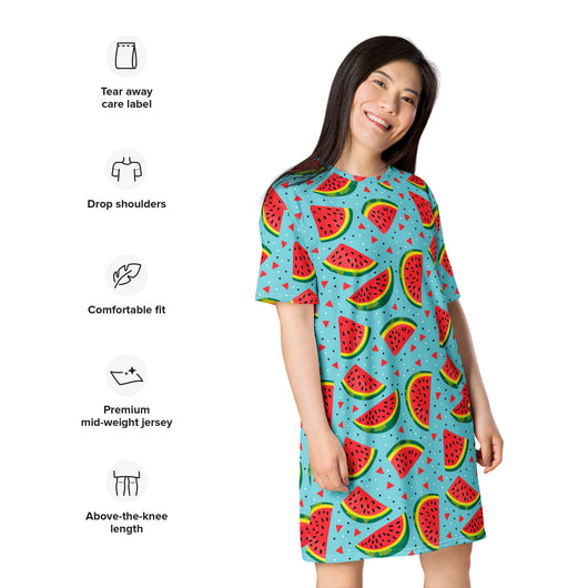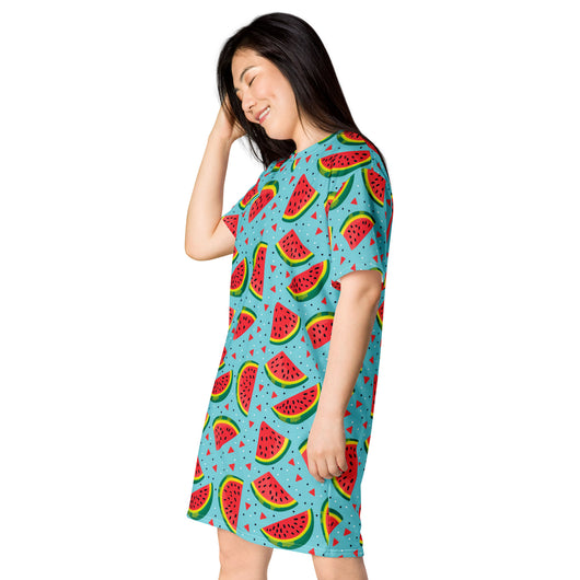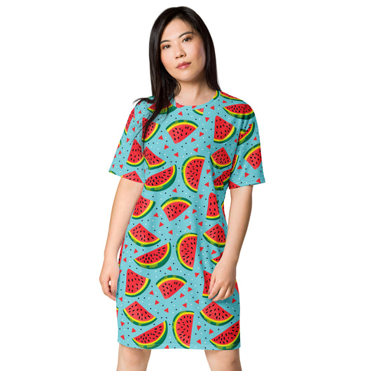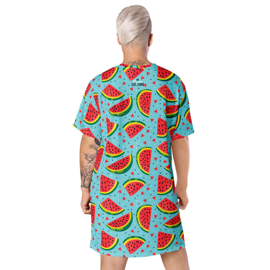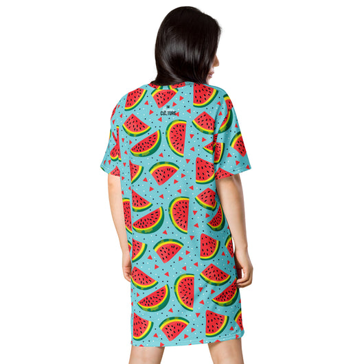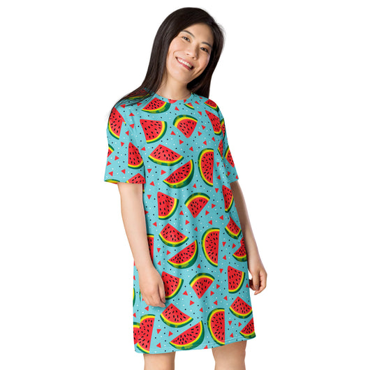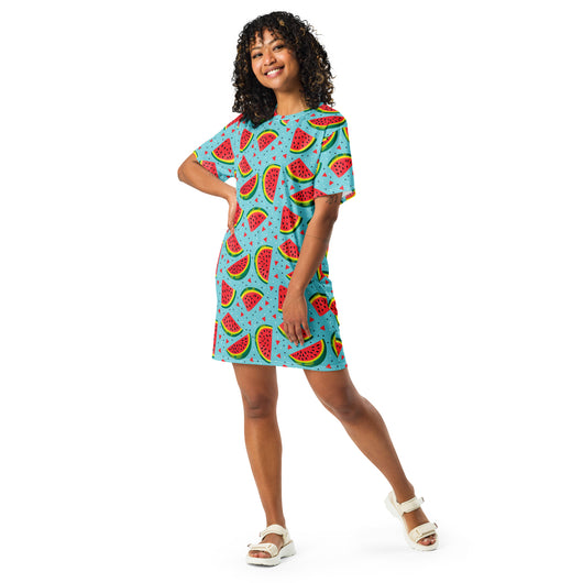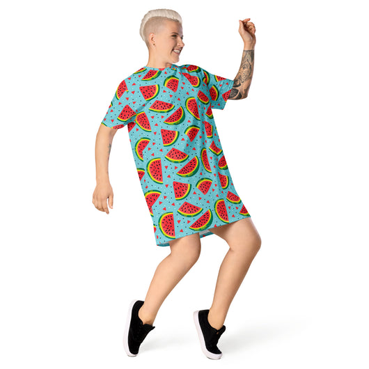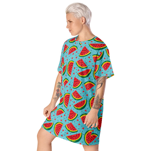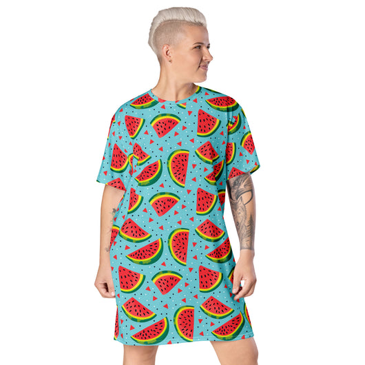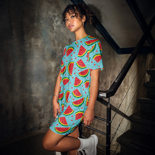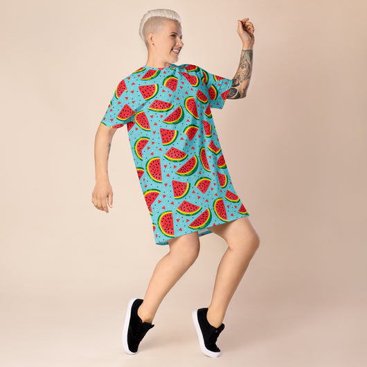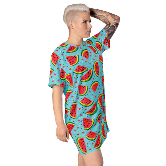 2XS - 6XL | Step into style with this yummy melon fruity print on blue background. Perfect for sneakers or heels, this versatile oversized t-shirt dress lets you create a unique look. Shine and make a statement wherever you go!