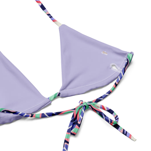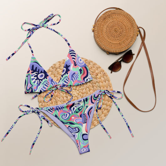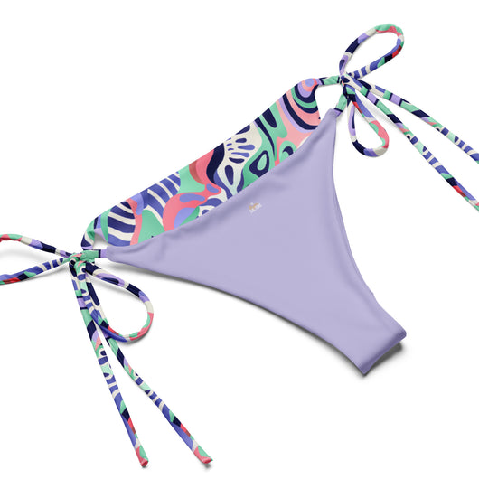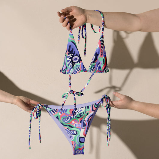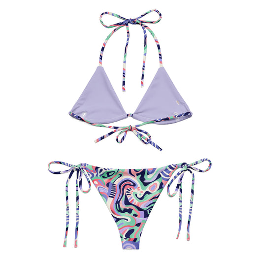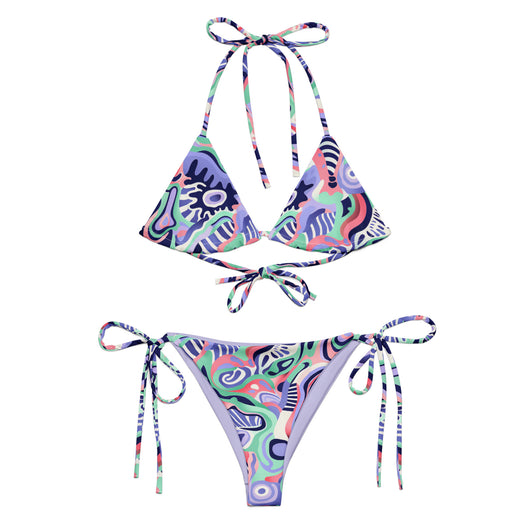 Stay comfortable and stylish all summer with this Coral Bliss Print Recycled String Bikini set, featuring a gorgeous swirly abstract coral print in pastel purple, pink and green colors. Made from soft recycled polyester with double-layering and UPF 50+ protection, this geometric bikini offers both comfort and sun safety. Available in sizes 2XS to 6XL, you can style the straps however you like and get ready to swim in this beautiful pastel geometric print swimwear.