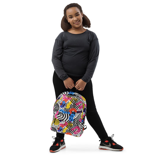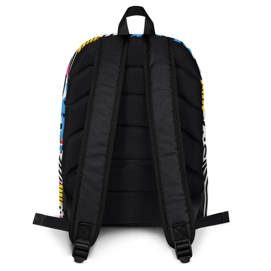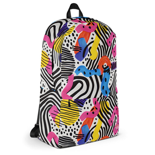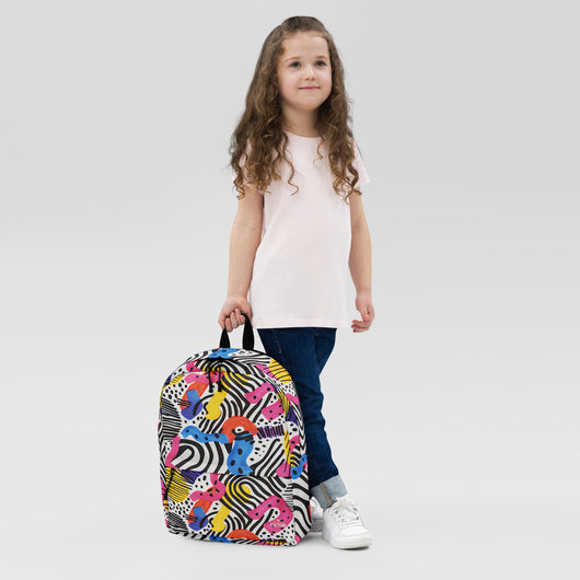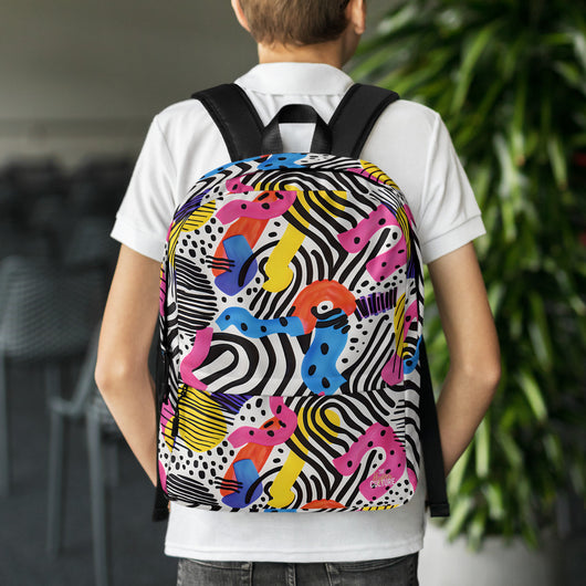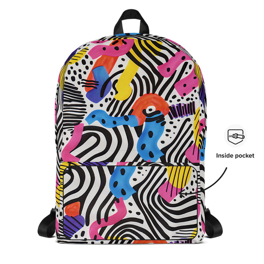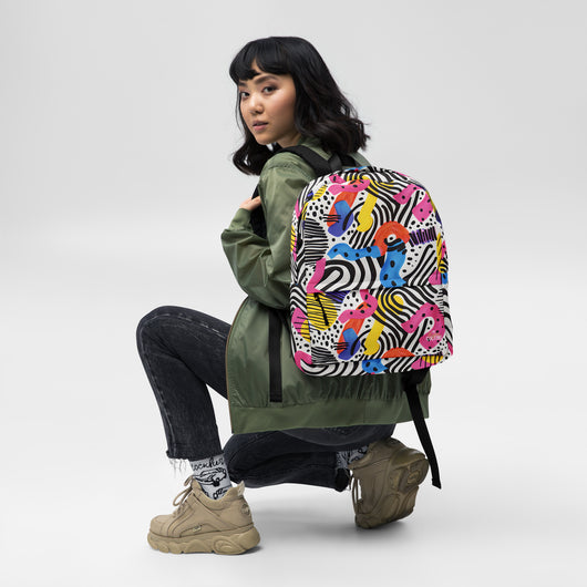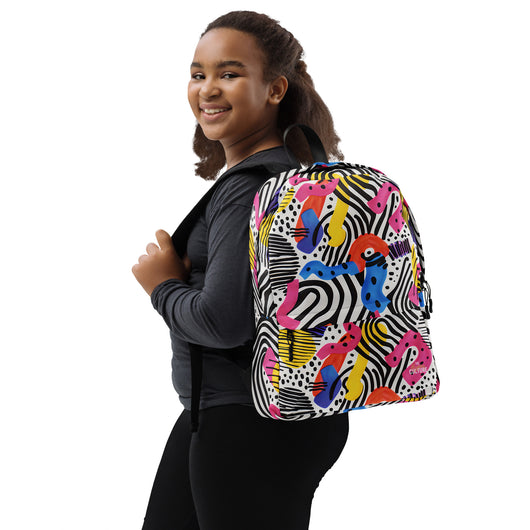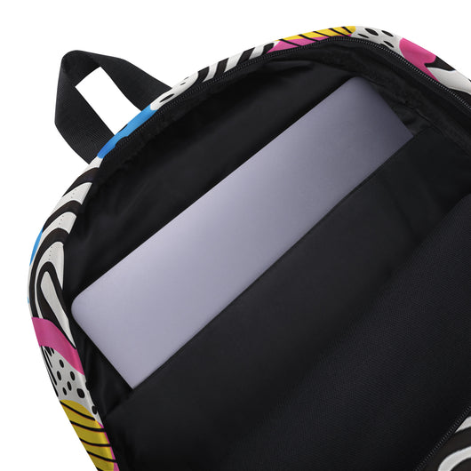 16â…ž" (42cm) x 12ÂĽ" (31cm), x 3â…ž" (10cm) | This medium-sized backpack, perfect for daily use or sports, is adorned with multicolored doodles on white background. Ideal for school, it has spacious pockets, fits a 15" laptop, and is water-resistant to protect belongings.