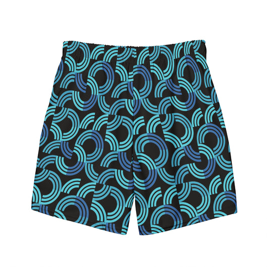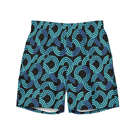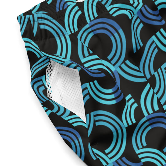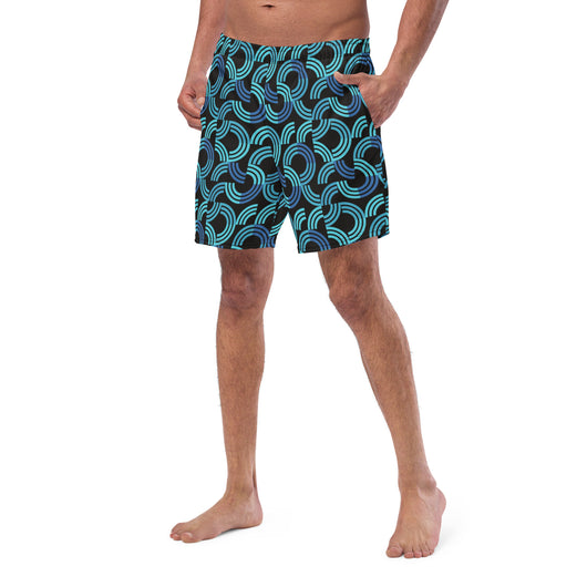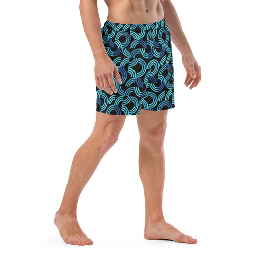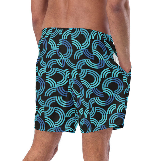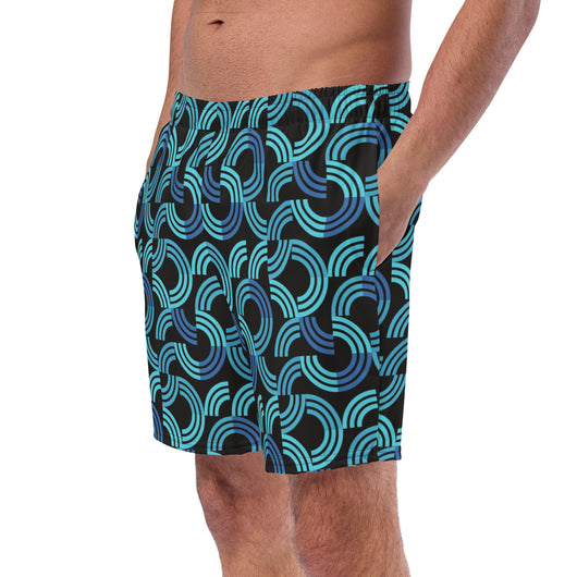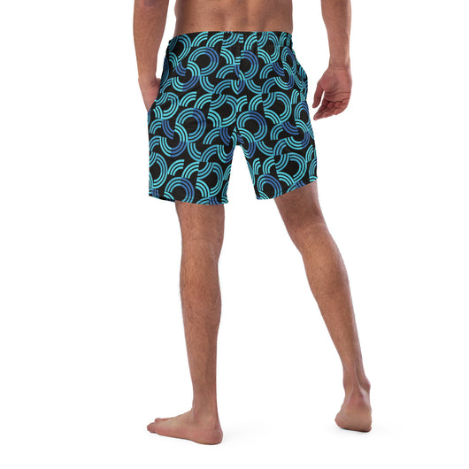 Introducing our men's swim trunks, showcasing a trendy blue half circular arc pattern on black background. These quick-drying, breathable men's swimwear essentials offer multiple pockets and a silky, anti-chafe inner liner. Available in sizes 2XS to 6XL, get yours now for ultimate comfort and standout style!