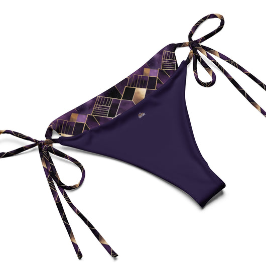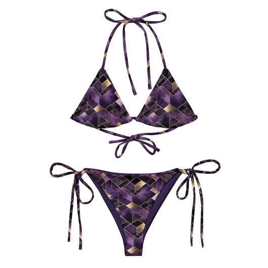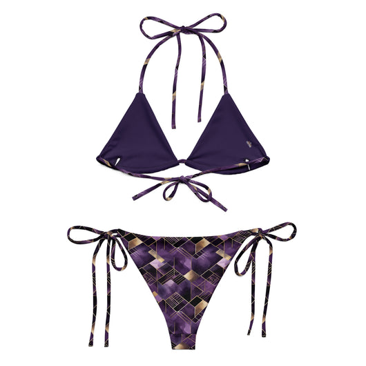 Stay comfortable and stylish all summer with this Iris Echoes Print Recycled String Bikini set, featuring a stunning purple, gold and black geometric mirror print. Made from soft recycled polyester with double-layering and UPF 50+ protection, this geometric bikini offers both comfort and sun safety. Available in sizes 2XS to 6XL, you can style the straps however you like and get ready to swim in this beautiful geometric print swimwear.