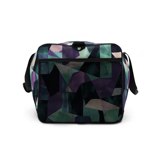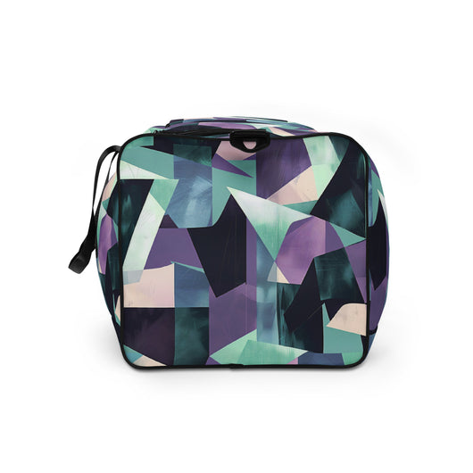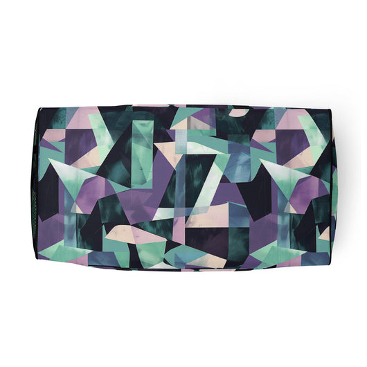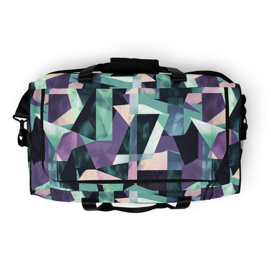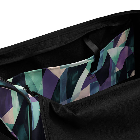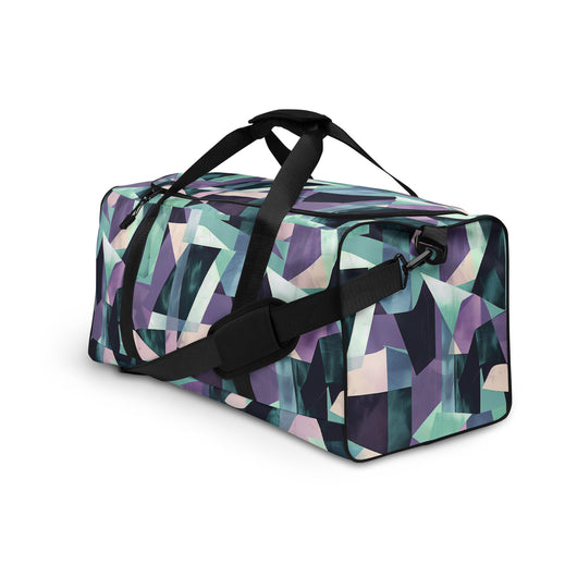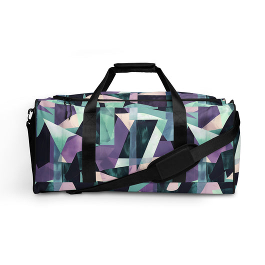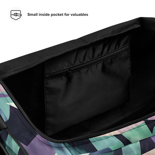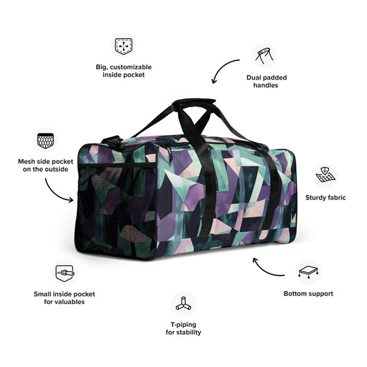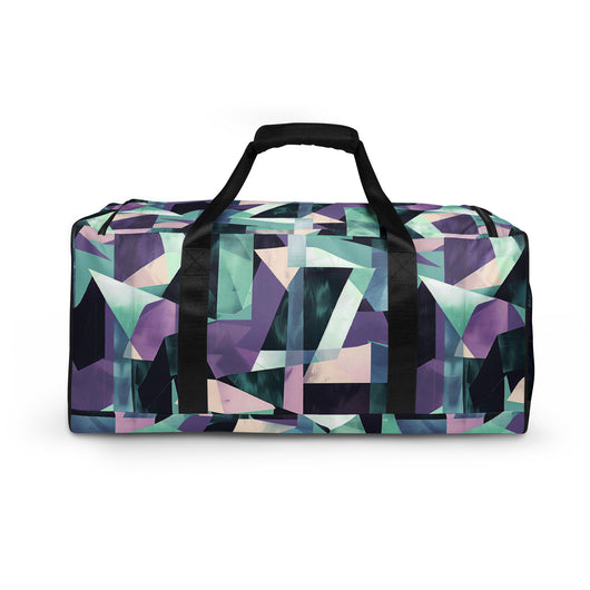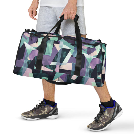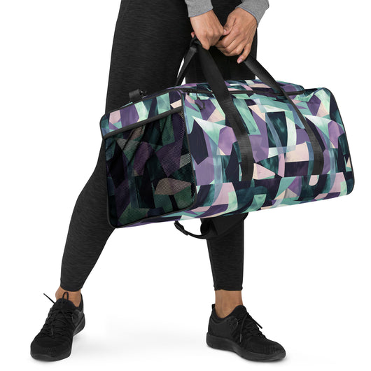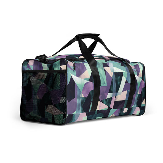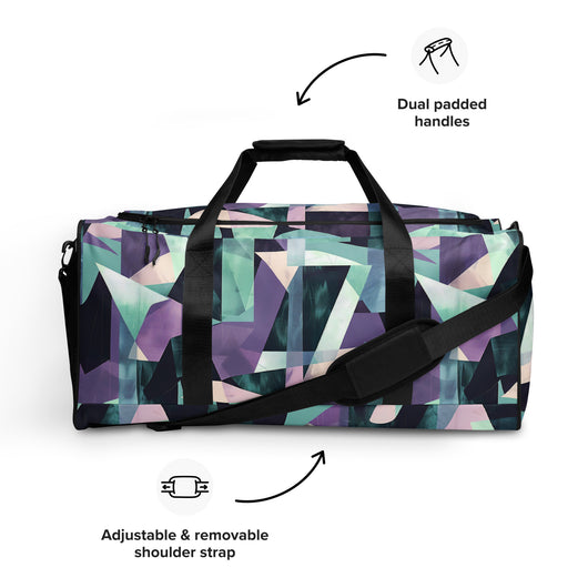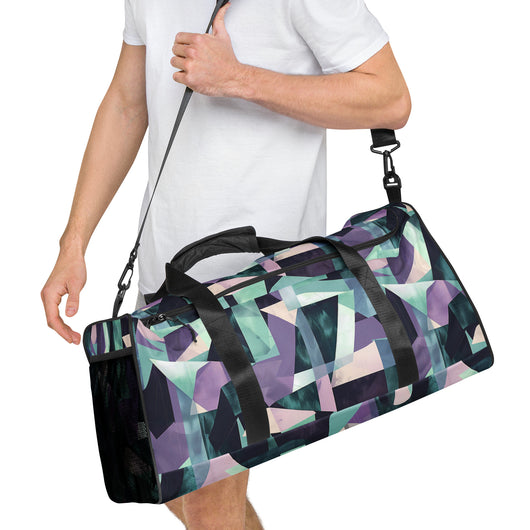 Introducing our versatile duffle bag, featuring a gorgeous abstract prismatic shard print in purple and green colors. Perfect for travel, daily errands, or gym sessions, it offers ample space and organized storage with multiple pockets, including a secure zippered compartment for valuables. The adjustable padded shoulder strap ensures comfort, making it effortless to carry heavier loads. Stay stylish and organized wherever you go with this essential accessory.
