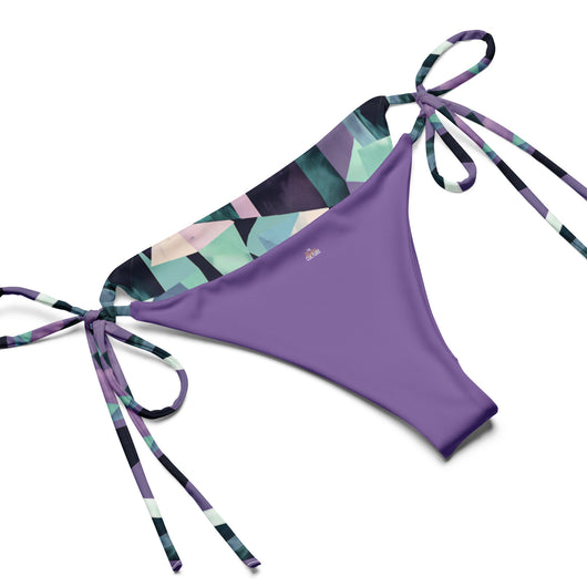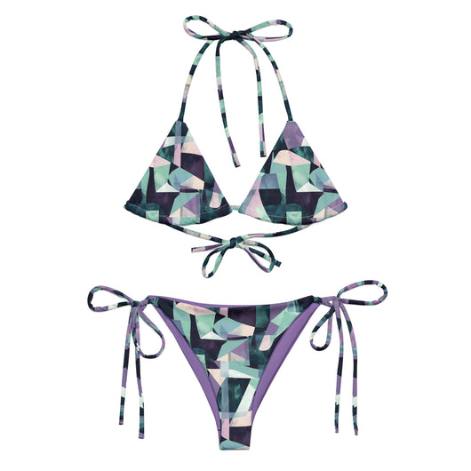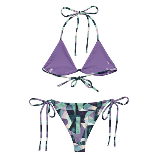 Stay comfortable and stylish all summer with this Kleido Shards Print Recycled String Bikini set, featuring a gorgeous abstract prismatic shard print in purple and green colors. Made from soft recycled polyester with double-layering and UPF 50+ protection, this geometric bikini offers both comfort and sun safety. Available in sizes 2XS to 6XL, you can style the straps however you like and get ready to swim in this beautiful geometric print swimwear.