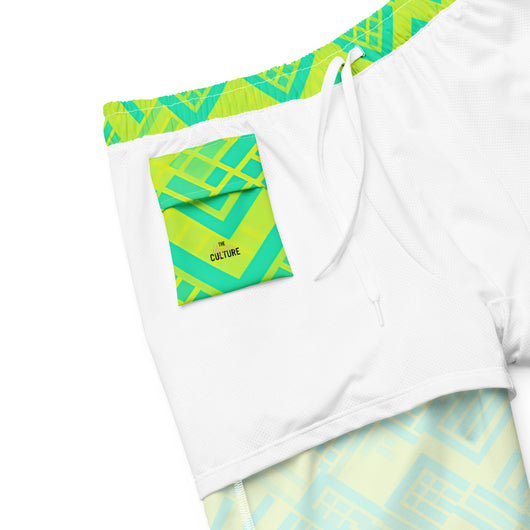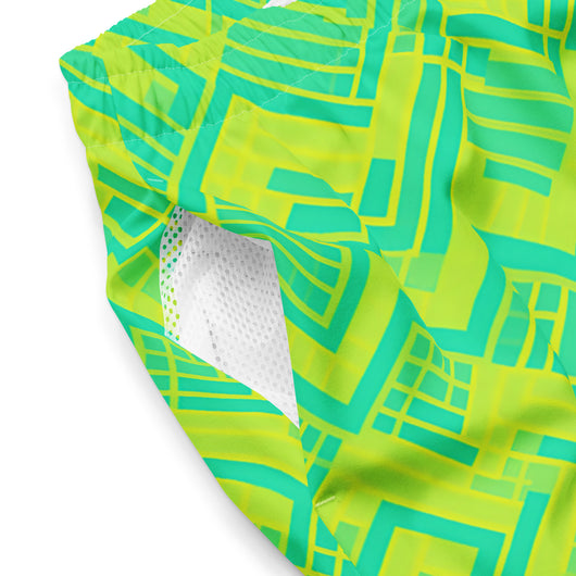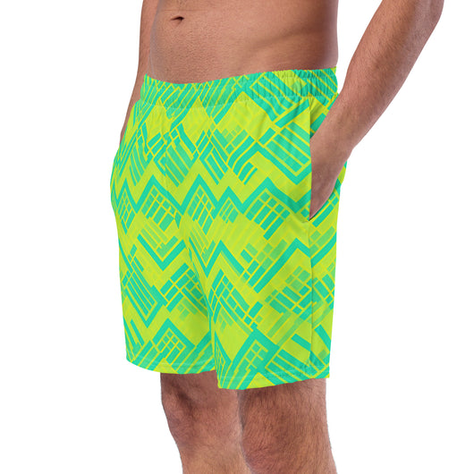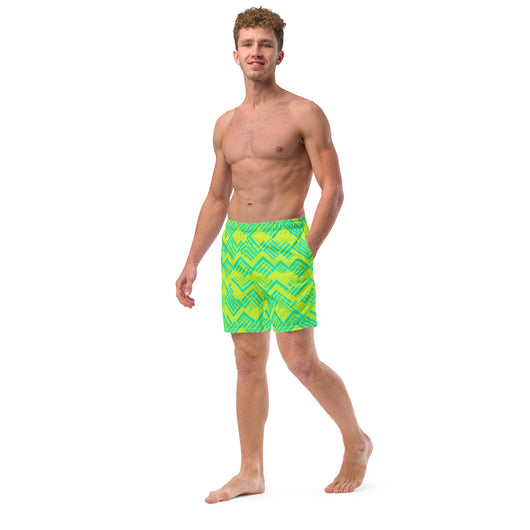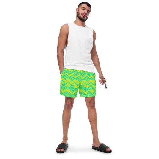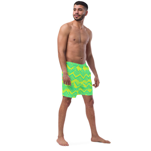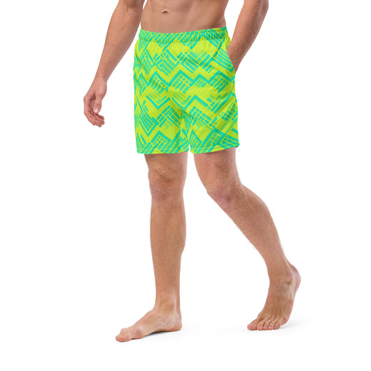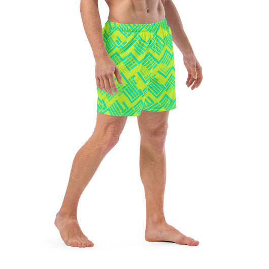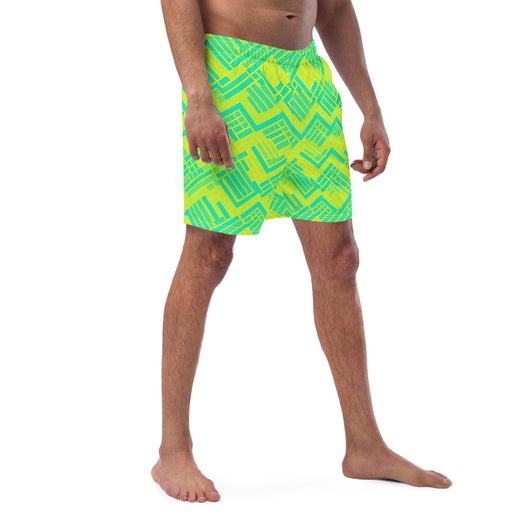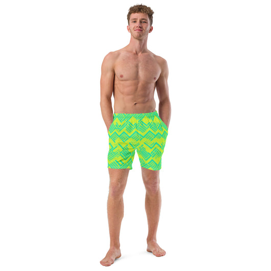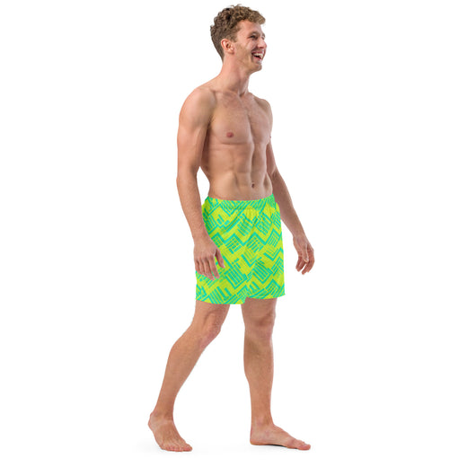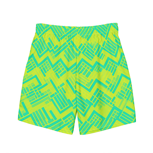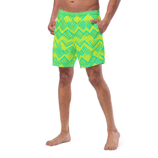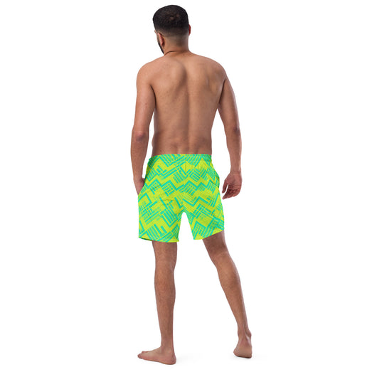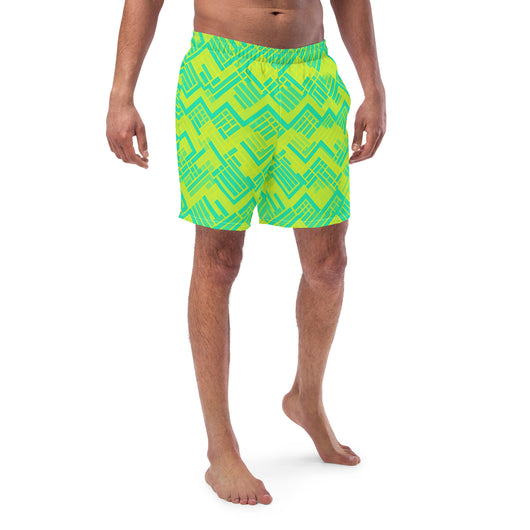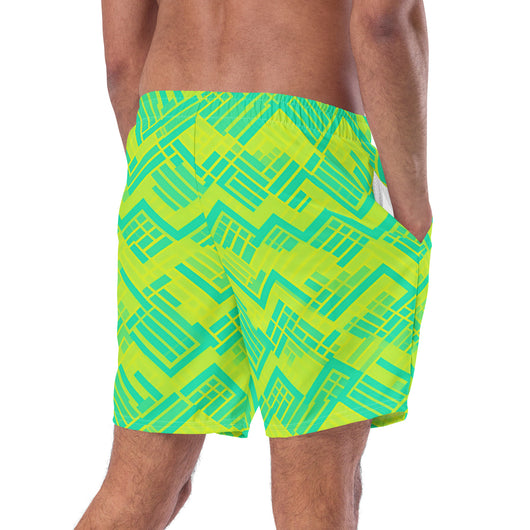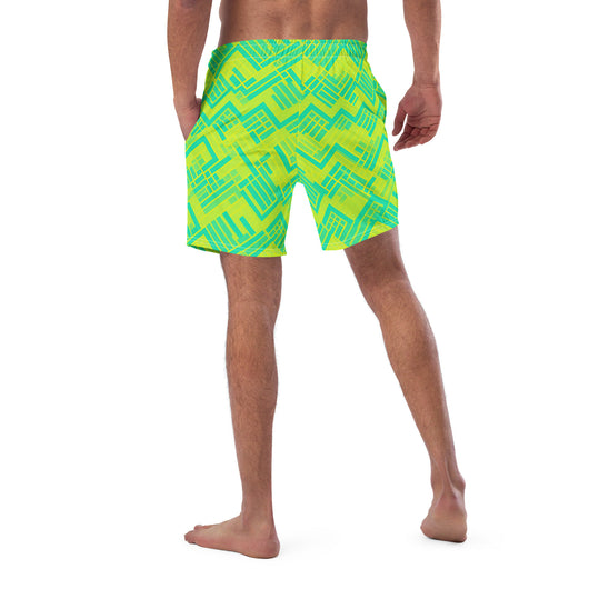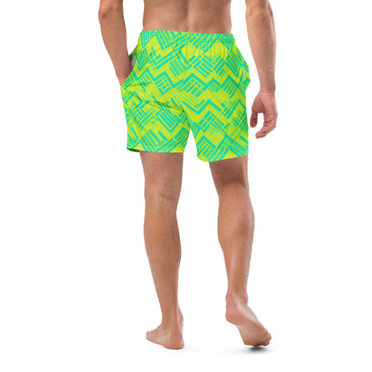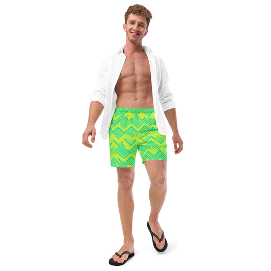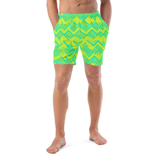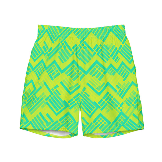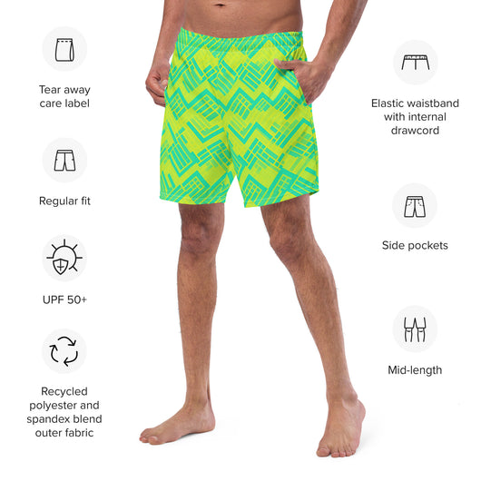 Introducing our men's swim trunks, showcasing a cool geometric print in neon green hues. These quick-drying, breathable men's swimwear essentials offer multiple pockets and a silky, anti-chafe inner liner. Available in sizes 2XS to 6XL, get yours now for ultimate comfort and standout style!