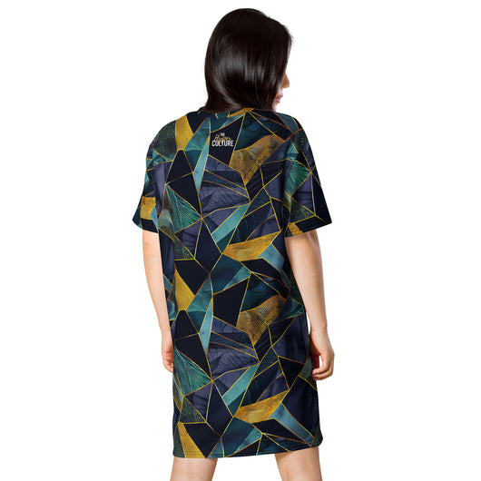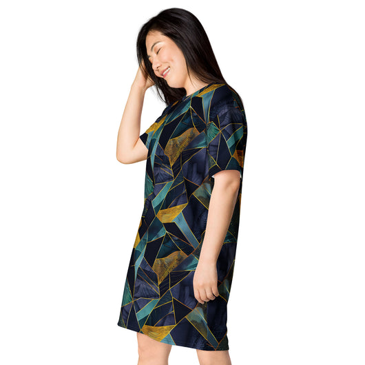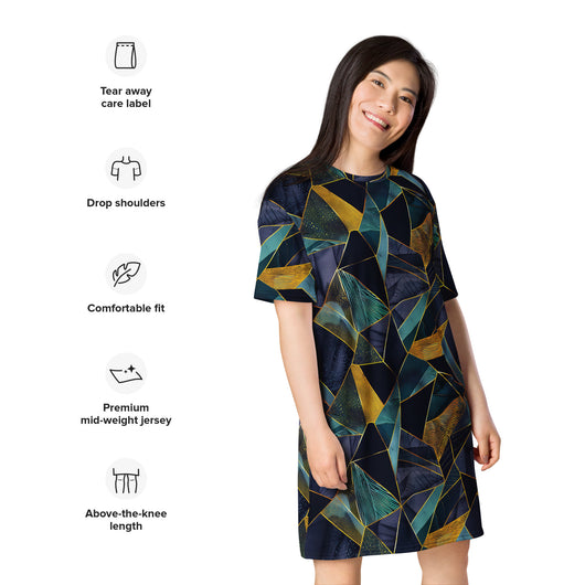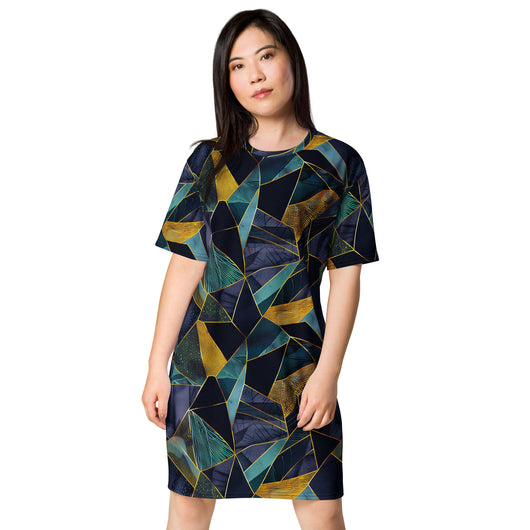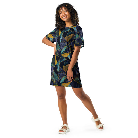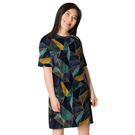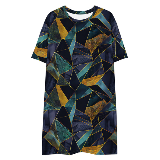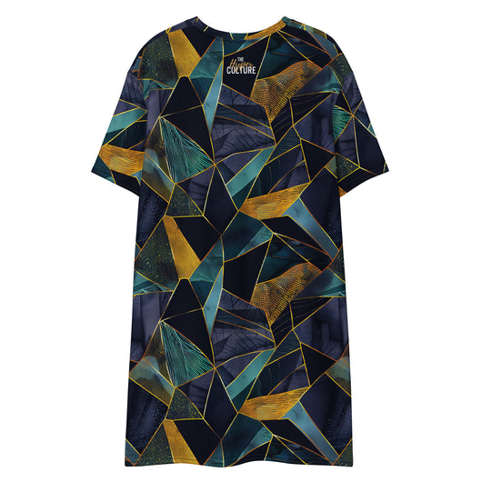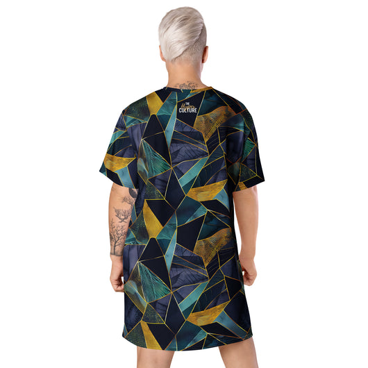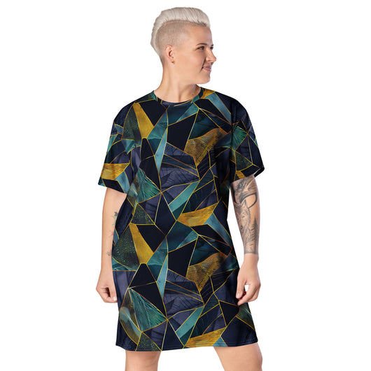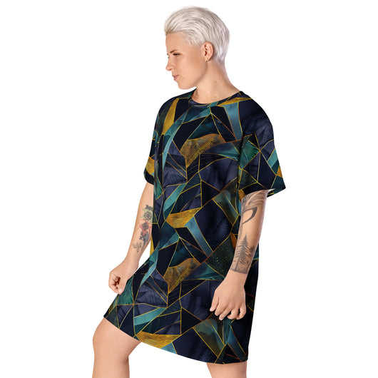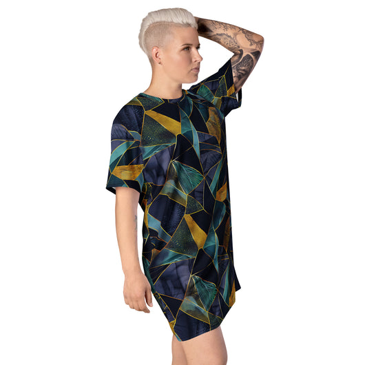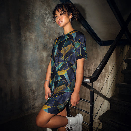 2XS - 6XL | Step into style with this unique and classy dark geometric print. Perfect for sneakers or heels, this versatile oversized t-shirt dress lets you create a unique look. Shine and make a statement wherever you go!