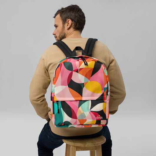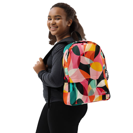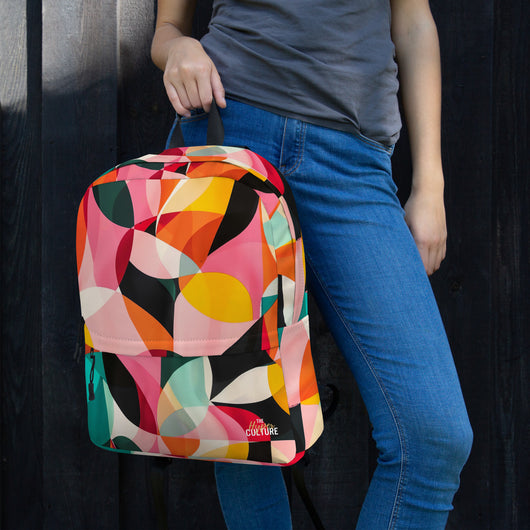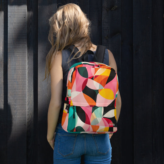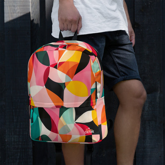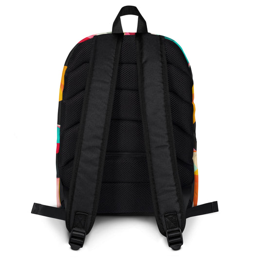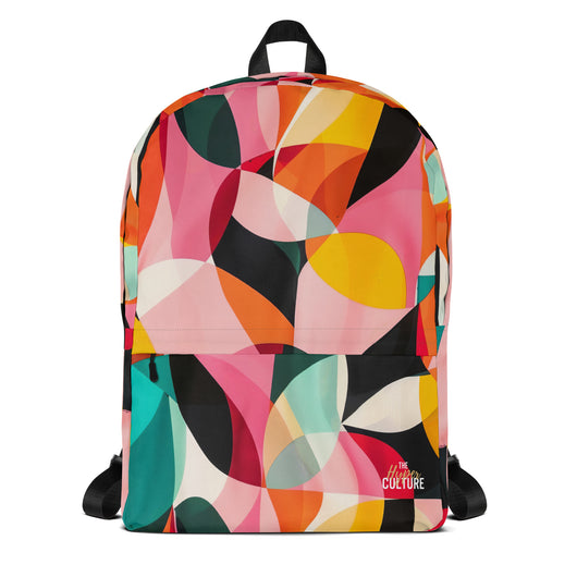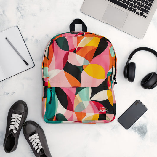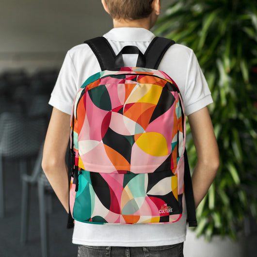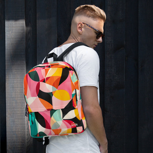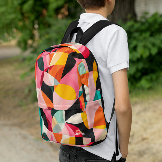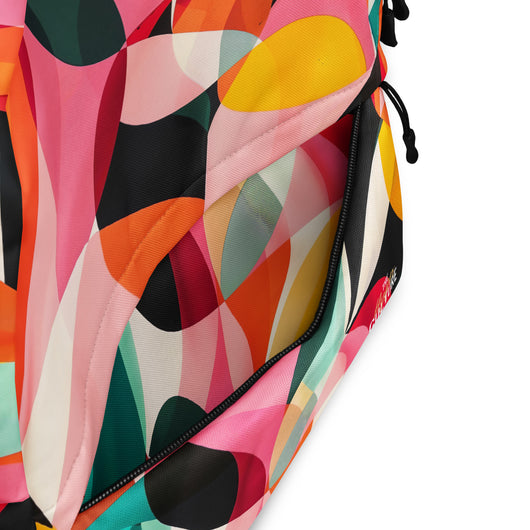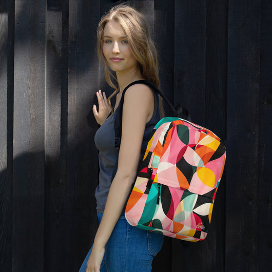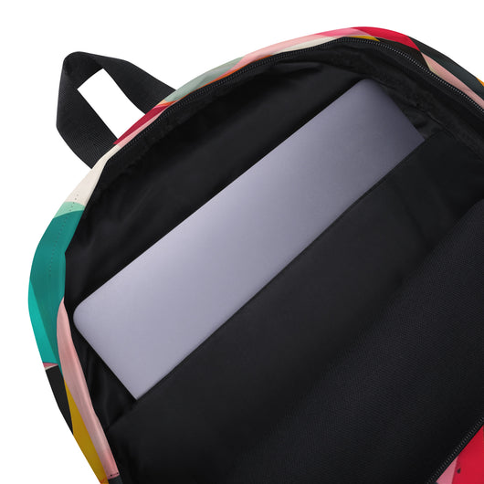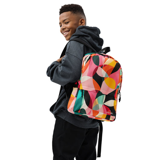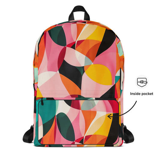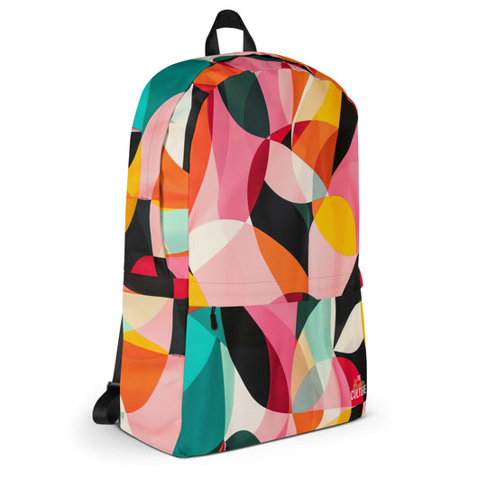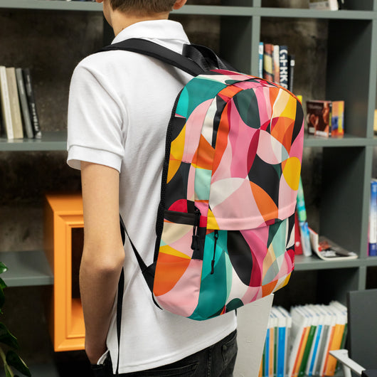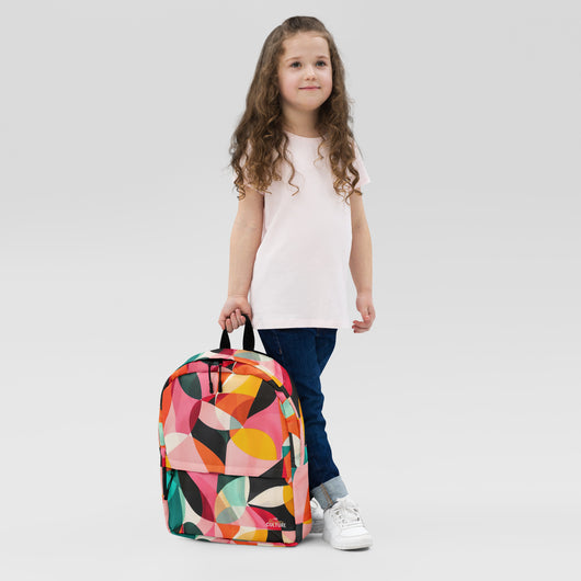 16â…ž" (42cm) x 12ÂĽ" (31cm), x 3â…ž" (10cm) | This medium-sized backpack, perfect for daily use or sports, is adorned with an abstract and fun geometric pattern with a burst of colors. Ideal for school, it has spacious pockets, fits a 15" laptop, and is water-resistant to protect belongings.