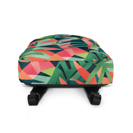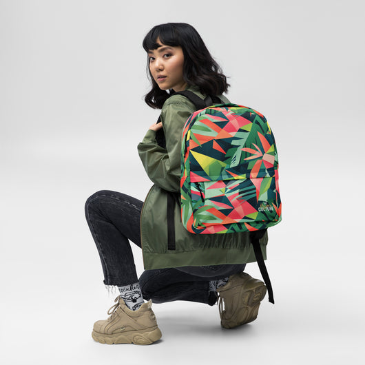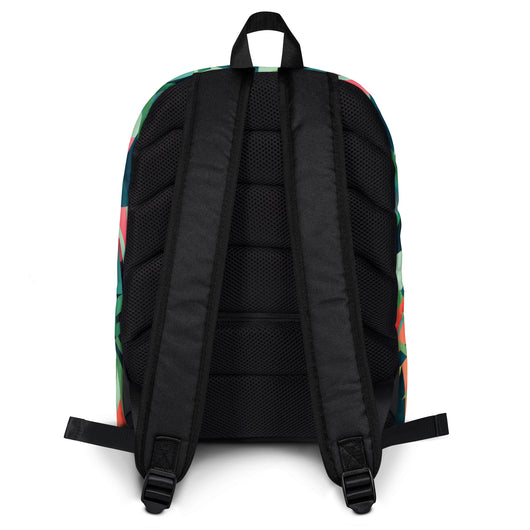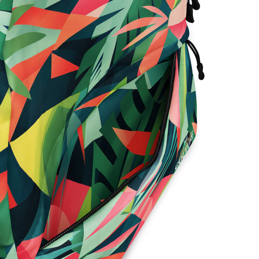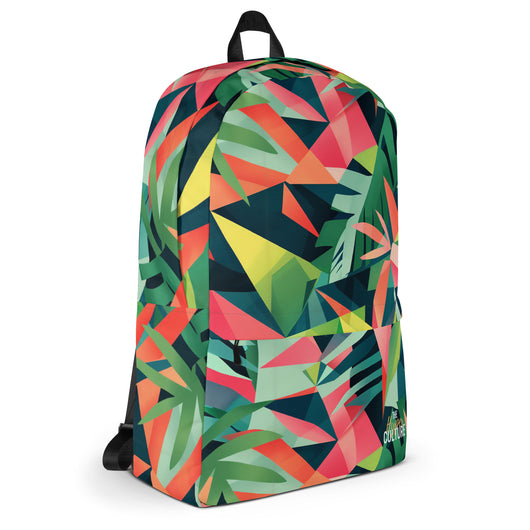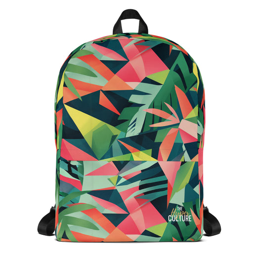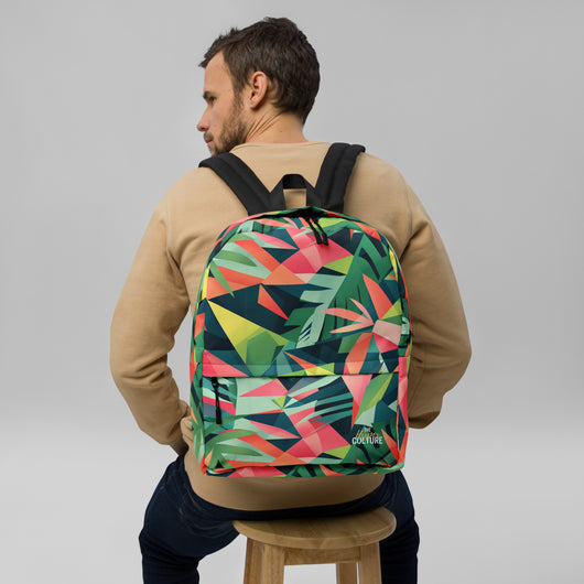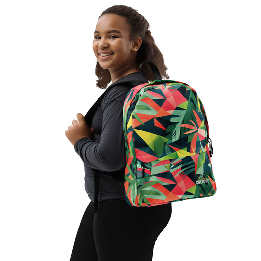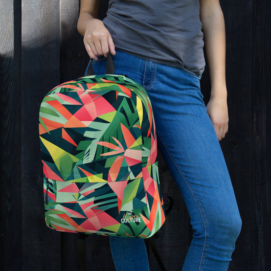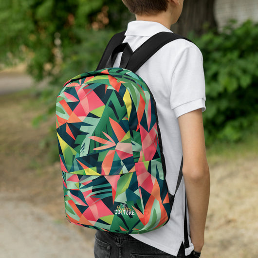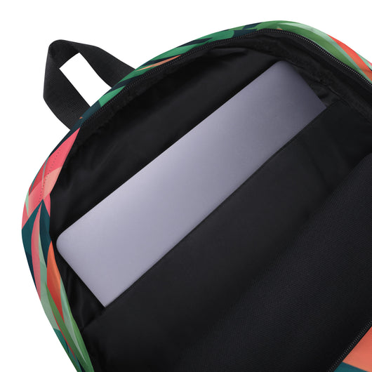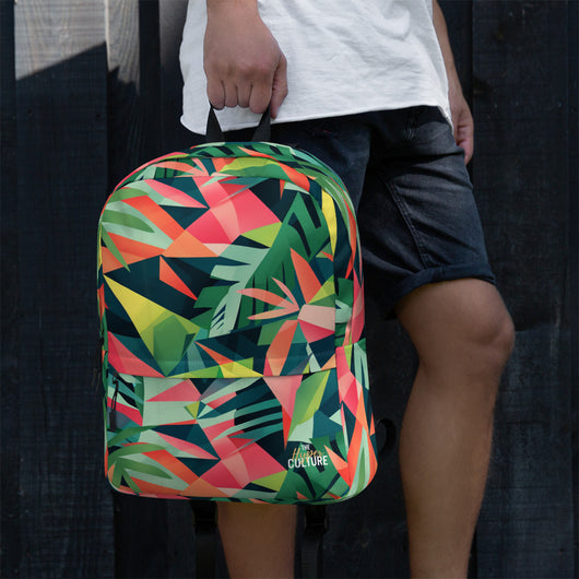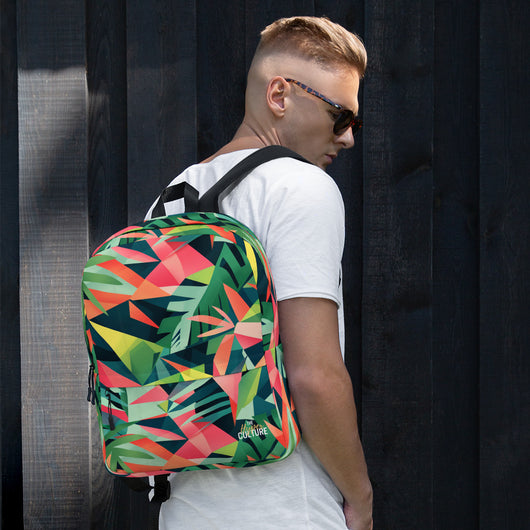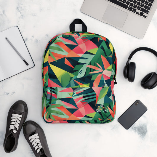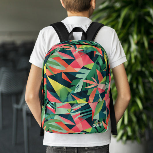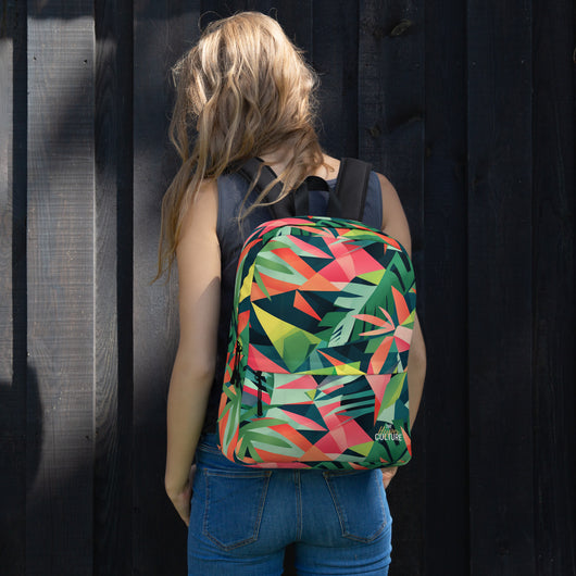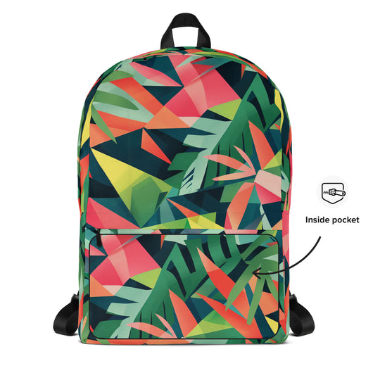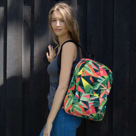 Medium-sized backpack is what you need for daily use or sports activities! Featuring a unique prism pattern with tropical leaves in green, pink and orange colors, it's perfect for adults & kids for school. Spacious pockets, including one for a 15" laptop. The water-resistant material keeps belongings protected.