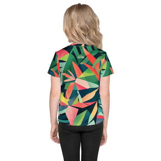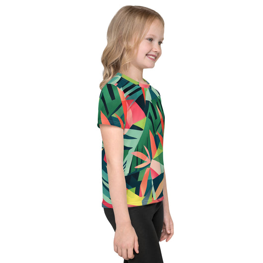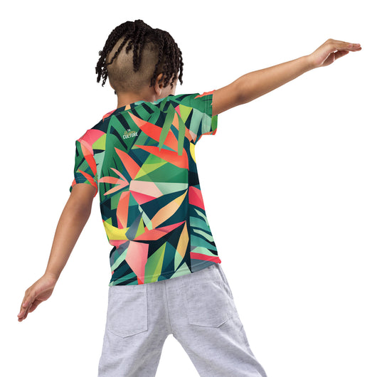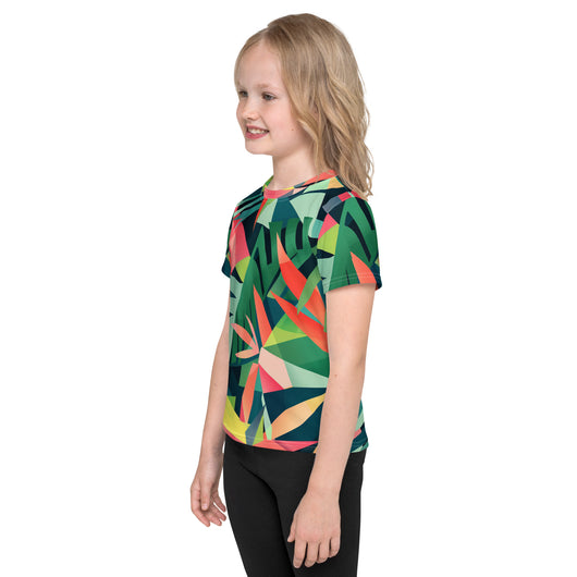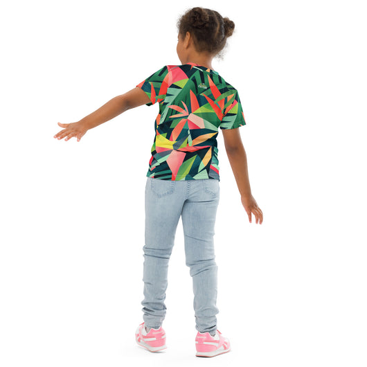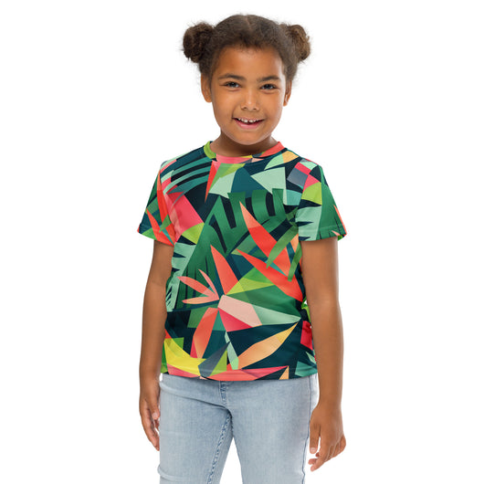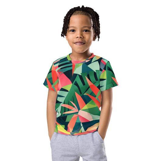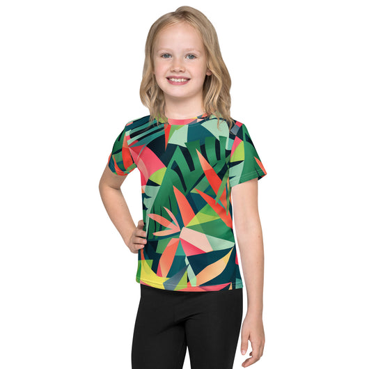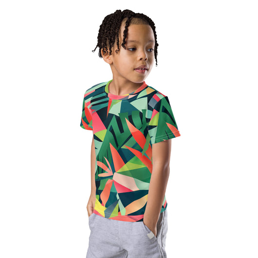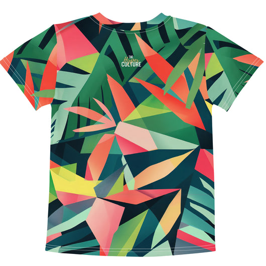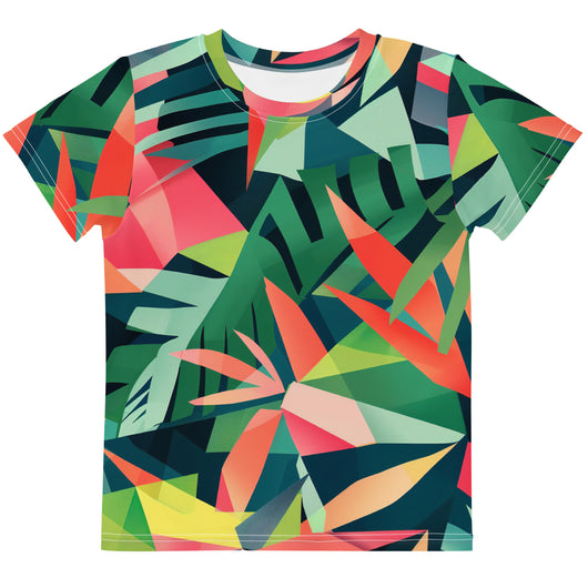 Sizes 2T - 7 | Get your kids ready for back to school with the ultimate kid's crew neck shirt. Featuring a unique prism pattern with tropical leaves in green, pink and orange colors, this stylish and comfortable tee is perfect for all their activities.