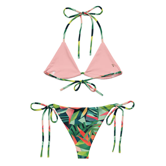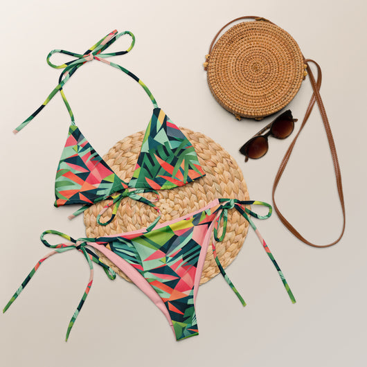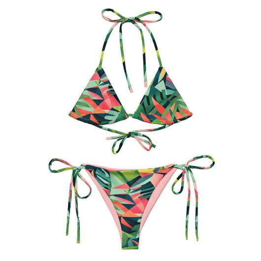Stay comfortable and stylish all summer with this Tropical Whimsy Print Recycled String Bikini set, featuring a unique prism pattern with tropical leaves in green, pink and orange colors. Made from soft recycled polyester with double-layering and UPF 50+ protection, this geometric bikini offers both comfort and sun safety. Available in sizes 2XS to 6XL, you can style the straps however you like and get ready to swim in this beautiful geometric print swimwear.