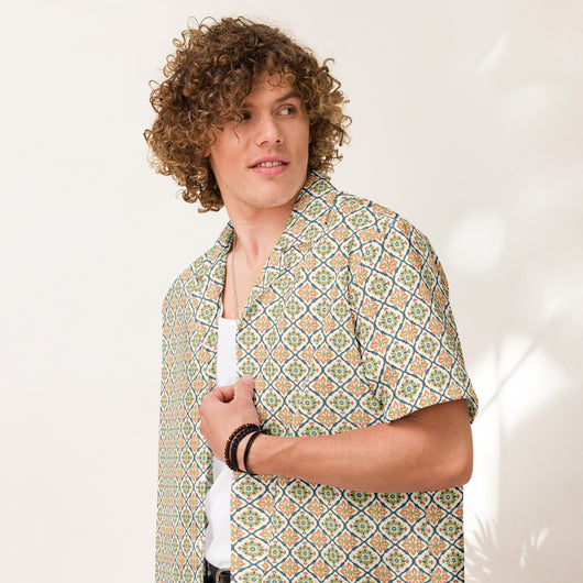 2XS - 6XL | Meet your new favorite summer shirt! Featuring a traditional boho floral motifs with soft green, pink, orange and blue colors in beige background, this shirt combines style and comfort. Its featherlight, moisture-wicking material keeps you cool even on the hottest days. Stay stylish all summer long!