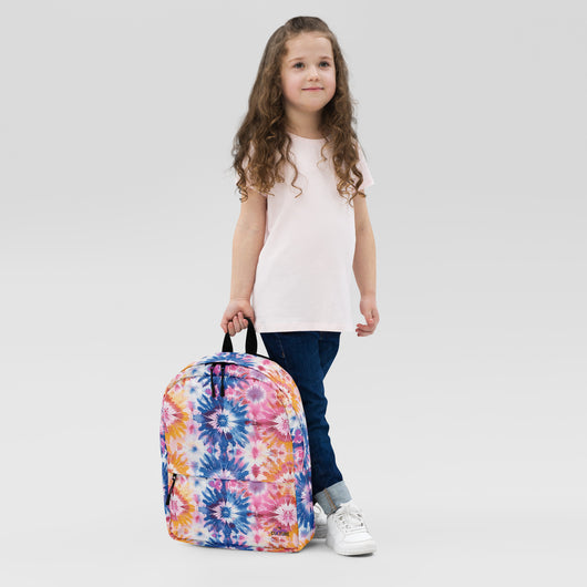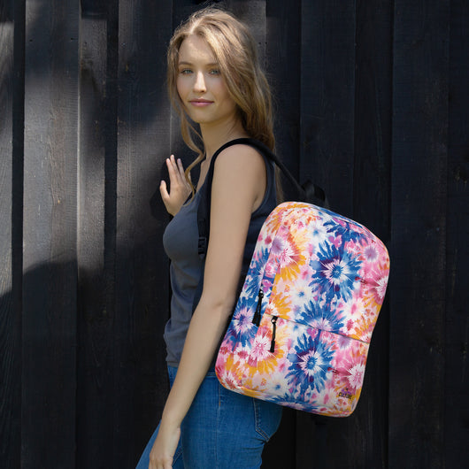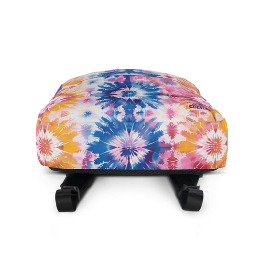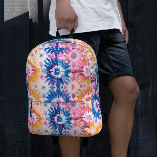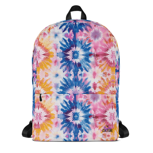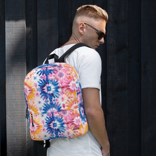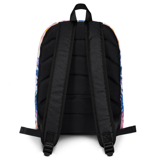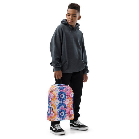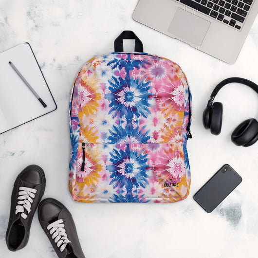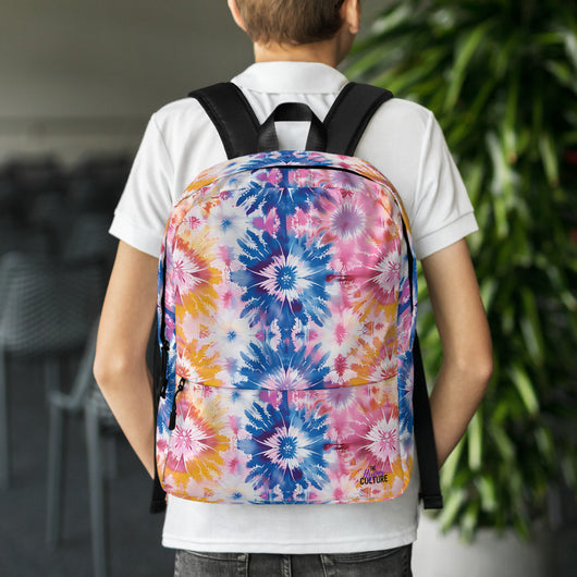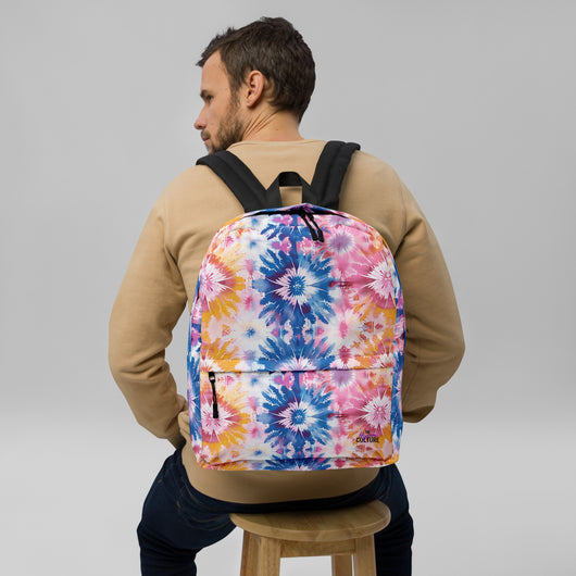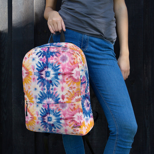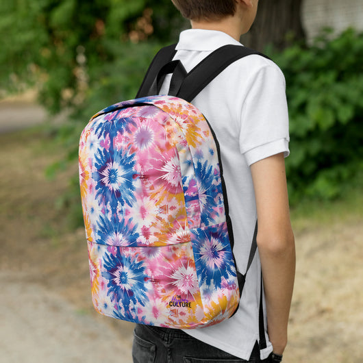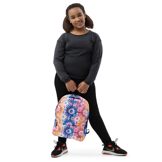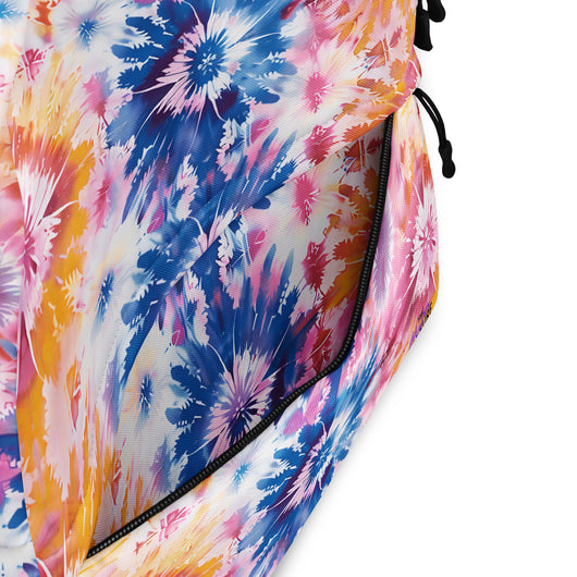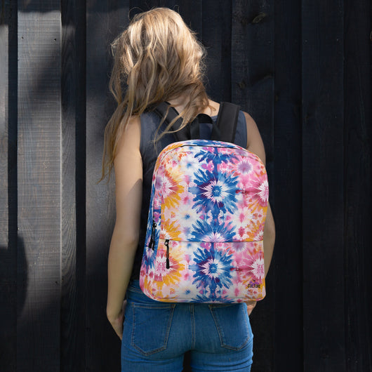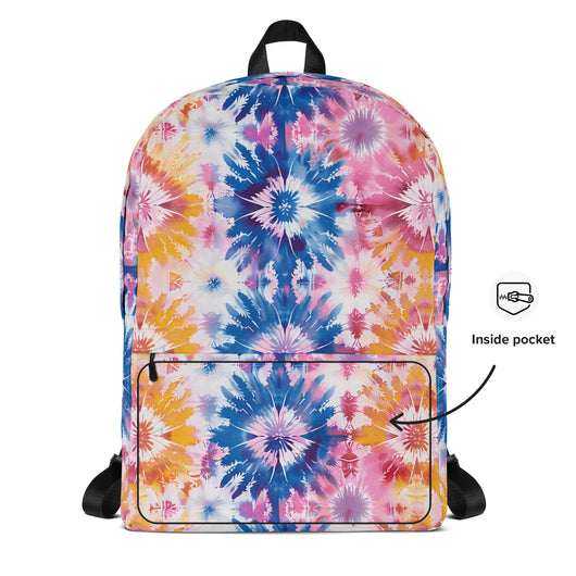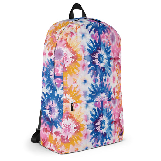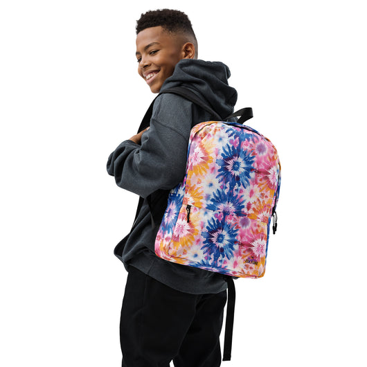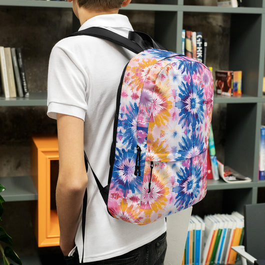 16â…ž" (42cm) x 12ÂĽ" (31cm), x 3â…ž" (10cm) | This medium-sized backpack, perfect for daily use or sports, is adorned with a gorgeous pastel orange, blue and pink tie & dye print. Ideal for school, it has spacious pockets, fits a 15" laptop, and is water-resistant to protect belongings.