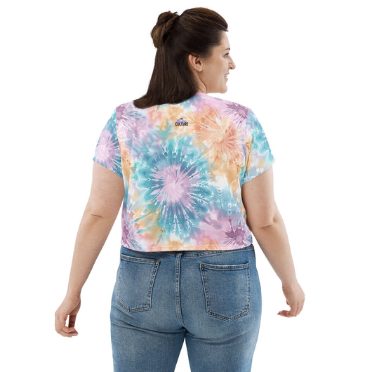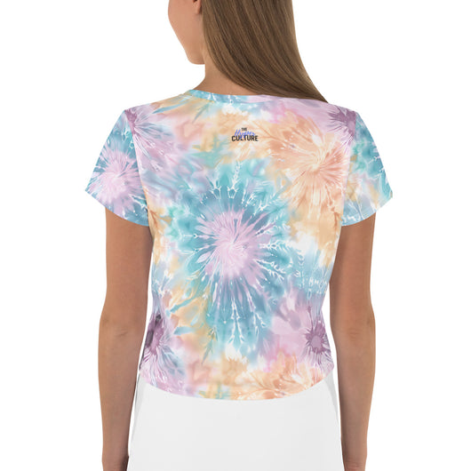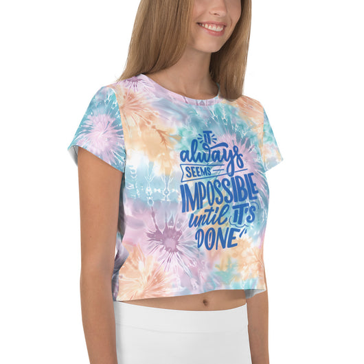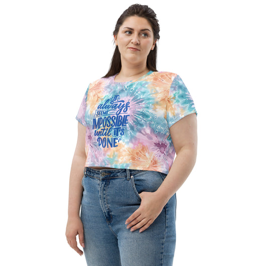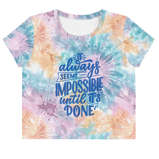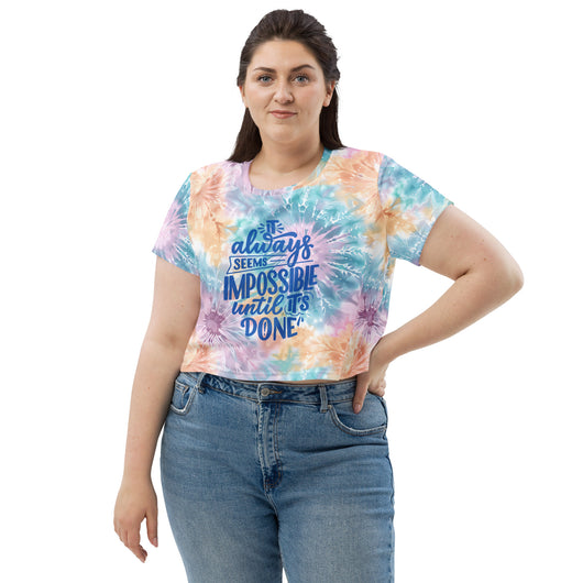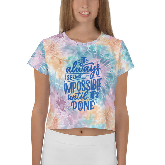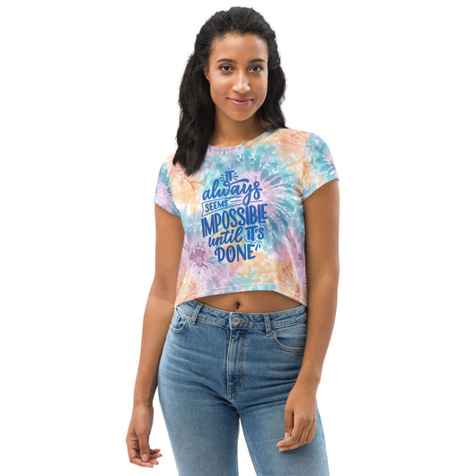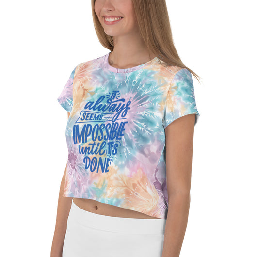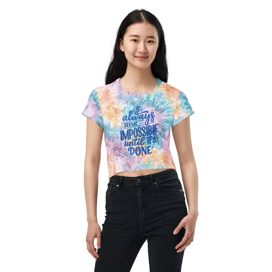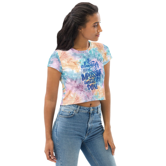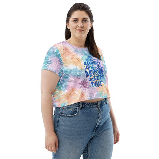 Ready to level up your wardrobe? This crop tee is your new go-to, printed and sewn to fit just right. Featuring a pastel tie-dye print with the phrase "It always seems impossible until it’s done," this tee is all about making a statement. Don't miss out—it's meant to be adored!