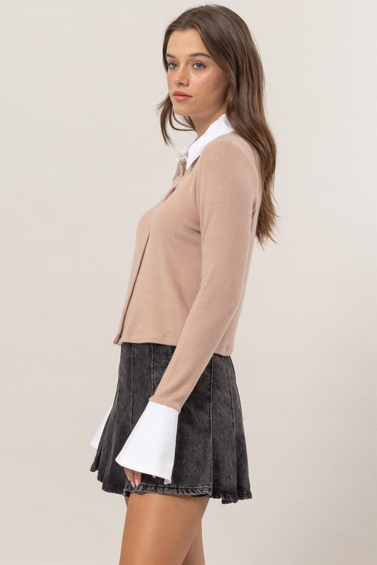 HYFVE Collared Contrast Button Down Crop Knit Cardigan