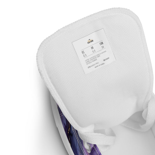 Adding a pair of classic and stylish high top canvas shoes to your wardrobe would be a fantastic choice. Featuring a luxurious purple ink print with gold lines to suit your style!