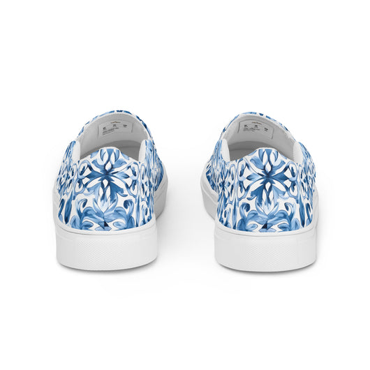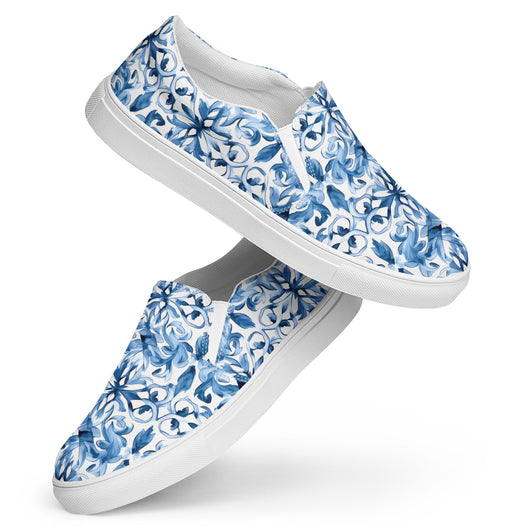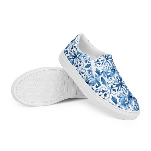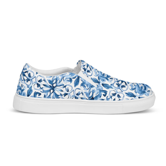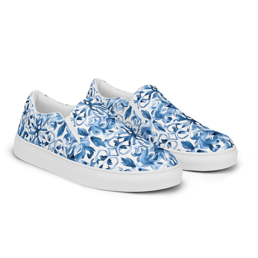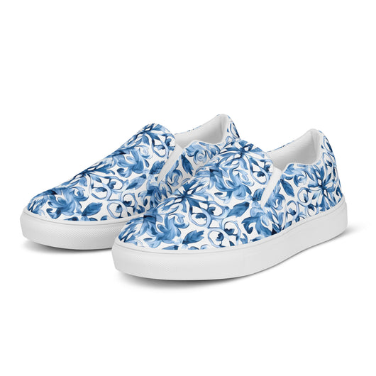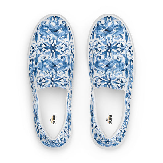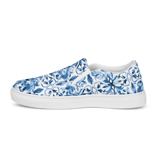 Step up your summer style with our unique rich tapestry blue printed canvas shoes, featuring a cool blue damask print on a white background. These women’s slip-ons are not only stylish but also incredibly comfy and convenient. Perfect for any outfit, these summer shoes offer soft, removable insoles for a customized fit and rubber outsoles for excellent traction. Enjoy the effortless ease of these printed canvas shoes—just slip them on and you’re ready to go!