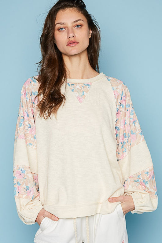 POL Round Neck Balloon Floral Long Sleeve Top