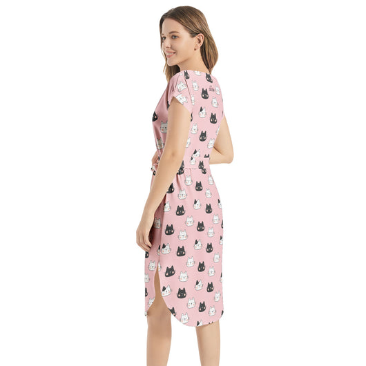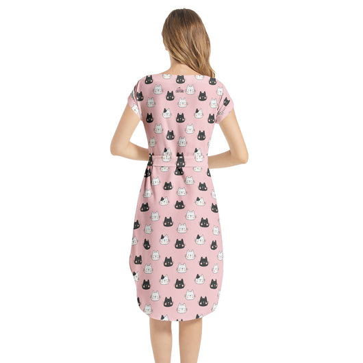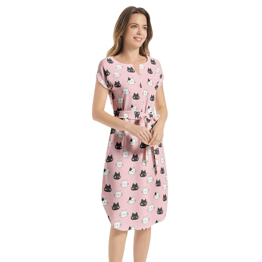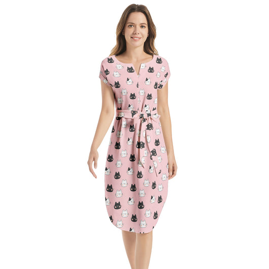 Get playful with this cute cat-print midi dress in pink! Made from non-stretch chiffon, it features batwing sleeves, a notched neck, and a belted waist for that perfect fit. With a straight hem and hidden side pockets, this dress is your go-to for parties, vacays, and beyond.
