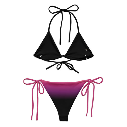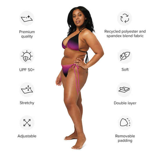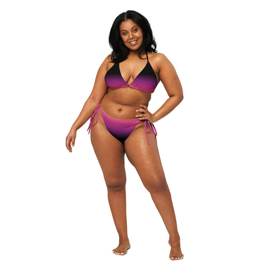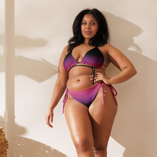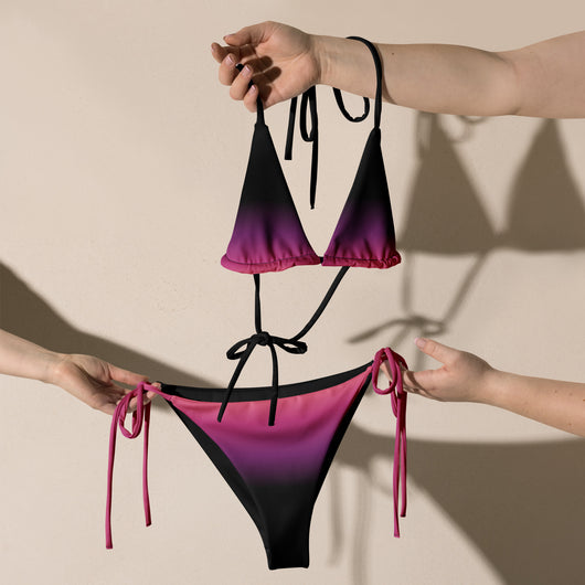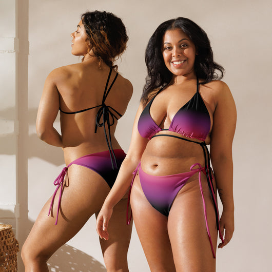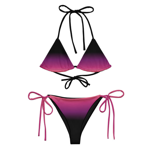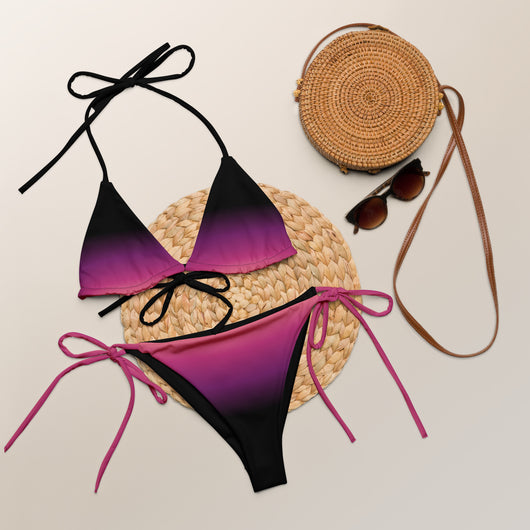 2XS - 6XL | Stay stylish and comfortable with the Pink Eclipse Recycled String Bikini. Made from soft recycled polyester with UPF 50+ protection, it features a gorgeous black, purple, pink and peach gradient. Customize the straps and enjoy your summer.