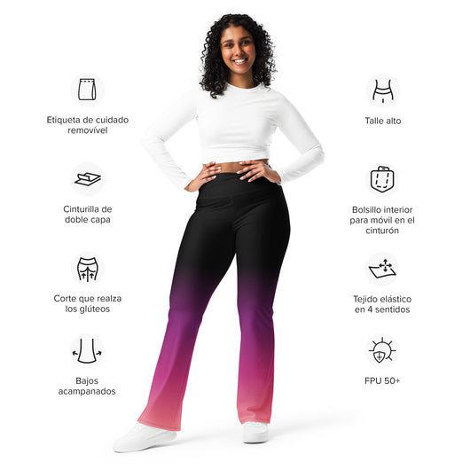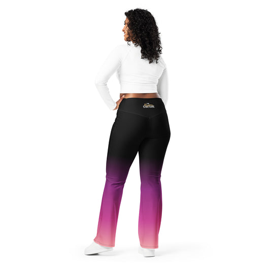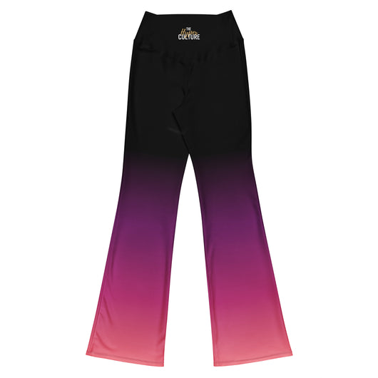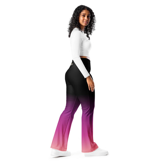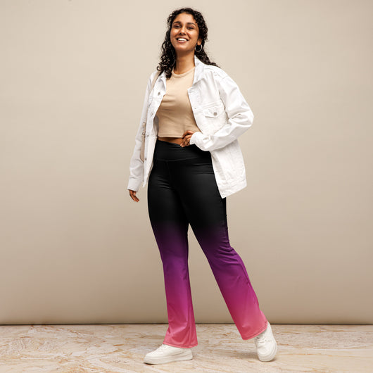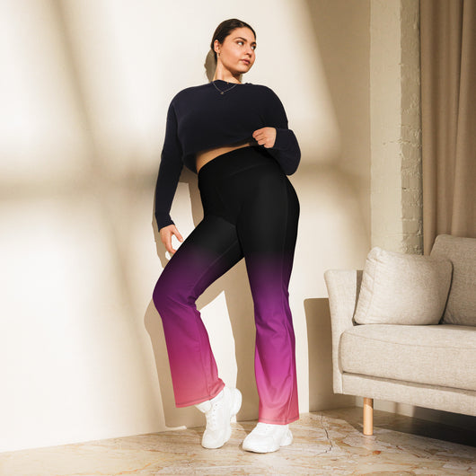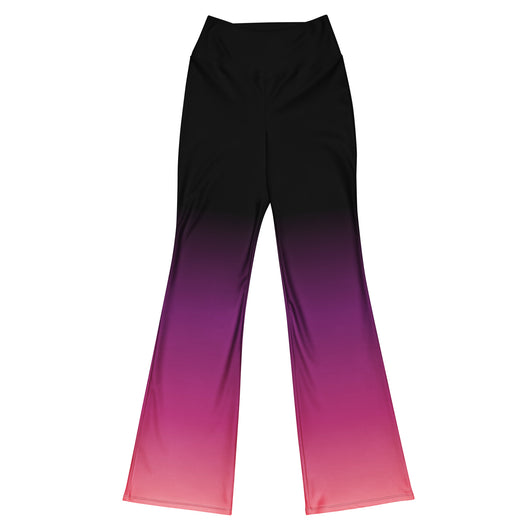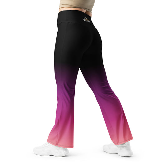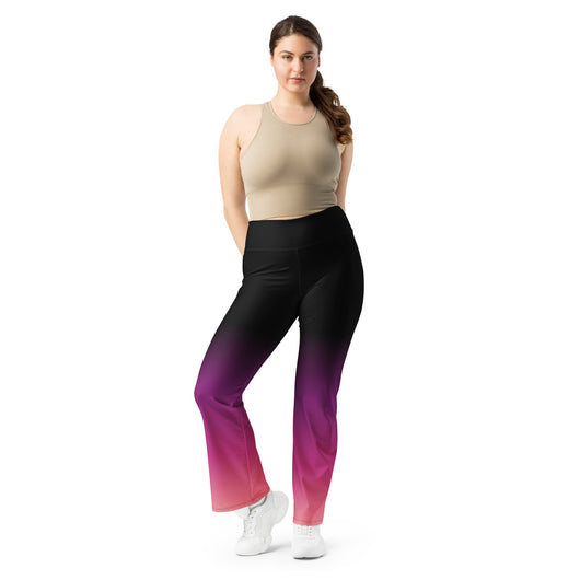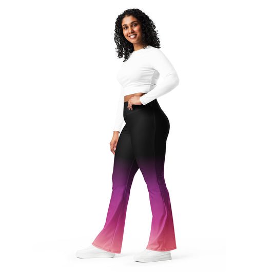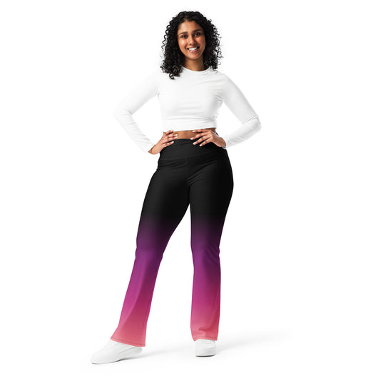 2XS - 6XL | Elevate your activewear with our flare leggings featuring a high waist and butt-lifting cut. Adorned with a gorgeous black, pink and peach gradient these trendy yoga leggings combine style and comfort with their flared leg bottoms. Perfect for the gym or casual wear, they’re a must-have addition to any wardrobe.
