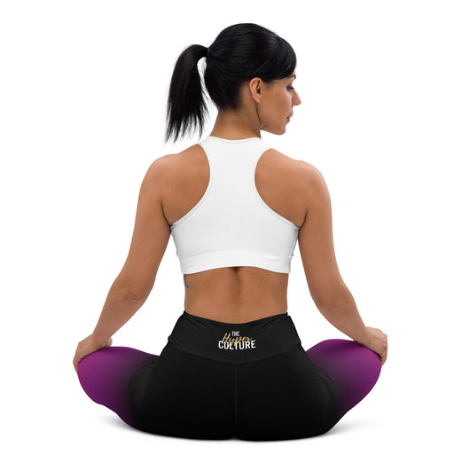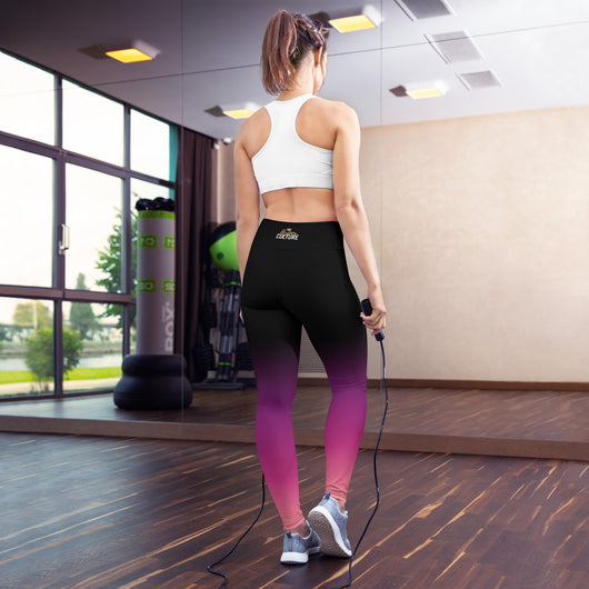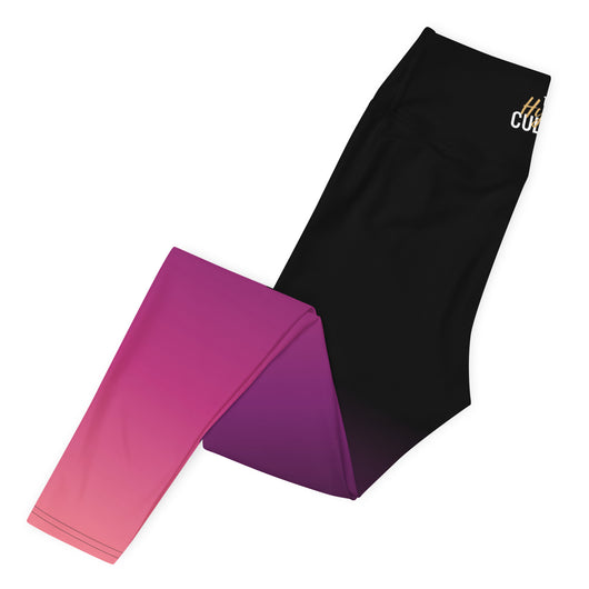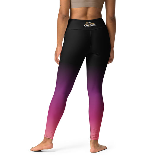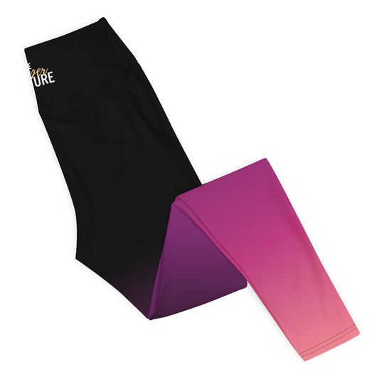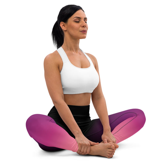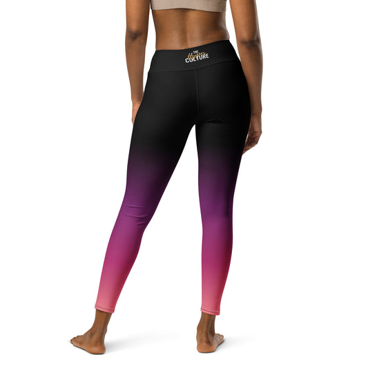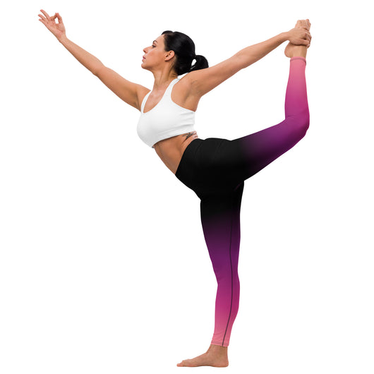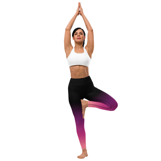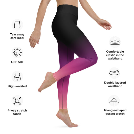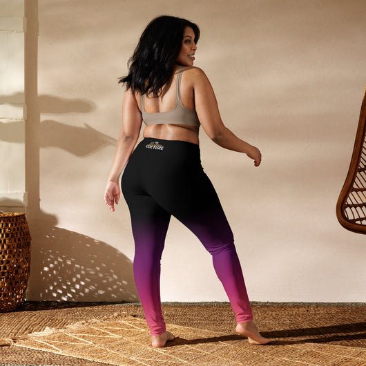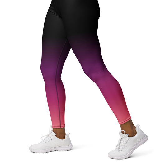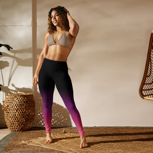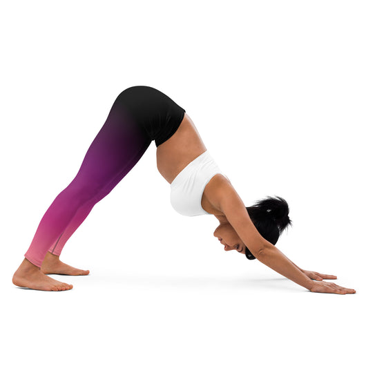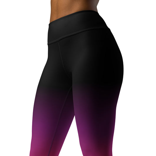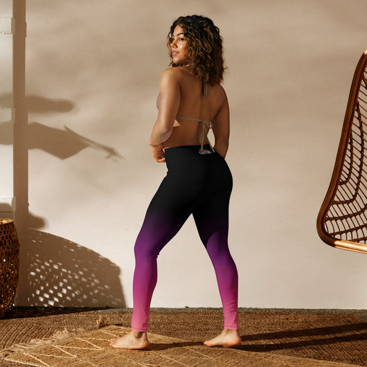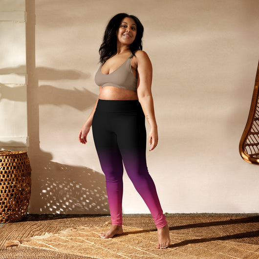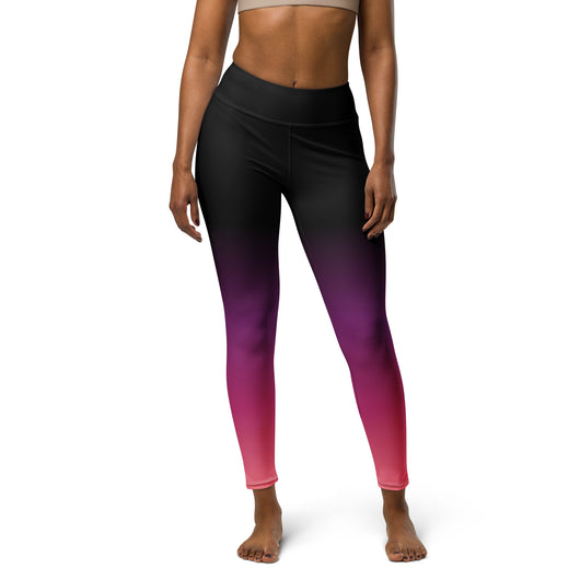 XS - XL | Discover unmatched comfort and flexibility with these yoga leggings. Adorned with a gorgeous black, purple, pink and peach gradient, they offer a soft, stretchy fit perfect for any yoga session. Elevate your practice with these stylish leggings.