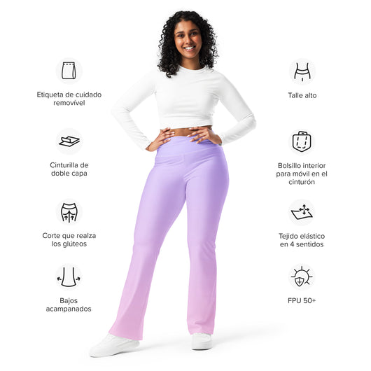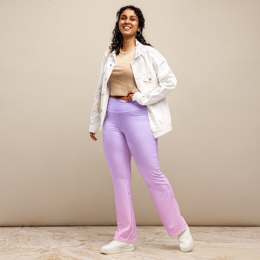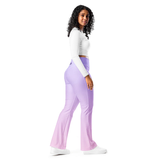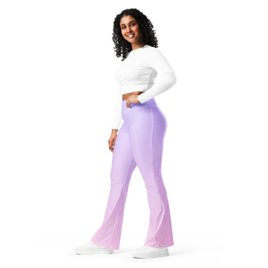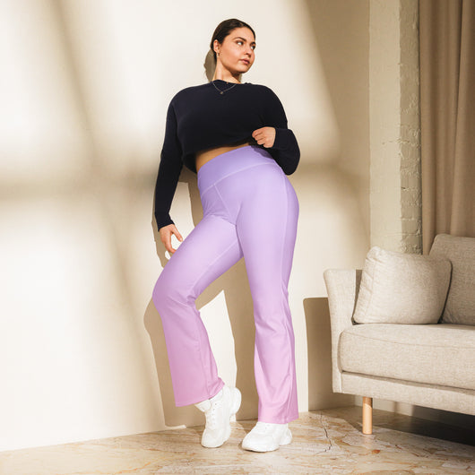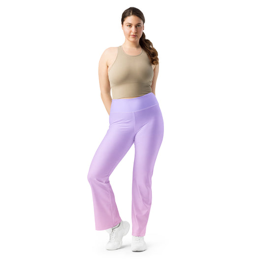 2XS - 6XL | Elevate your activewear with our flare leggings featuring a high waist and butt-lifting cut. Adorned with a gorgeous purple to pink gradient, these trendy yoga leggings combine style and comfort with their flared leg bottoms. Perfect for the gym or casual wear, they’re a must-have addition to any wardrobe.