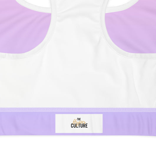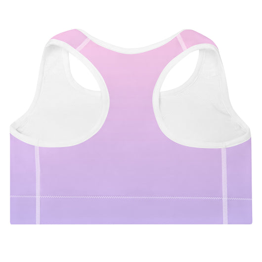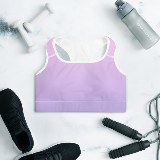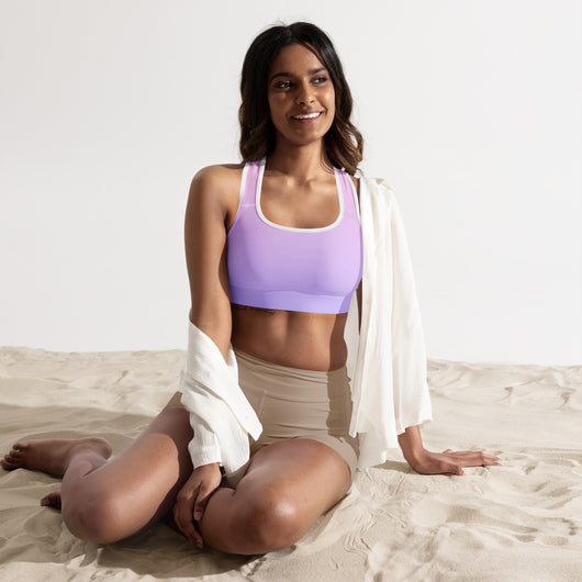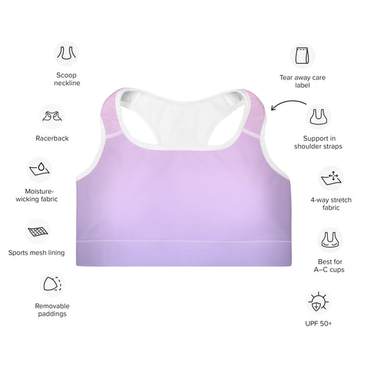 Discover the perfect sports bra for your workouts! This comfy bra, available in sizes XS to 2XL, features soft, moisture-wicking fabric, extra material in the shoulder straps, and removable padding for maximum support. Adorned with a gorgeous purple to pink gradient, it combines style and functionality seamlessly.