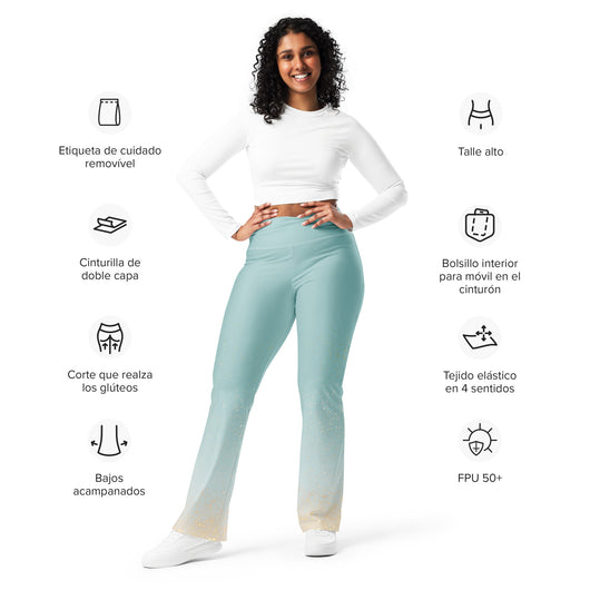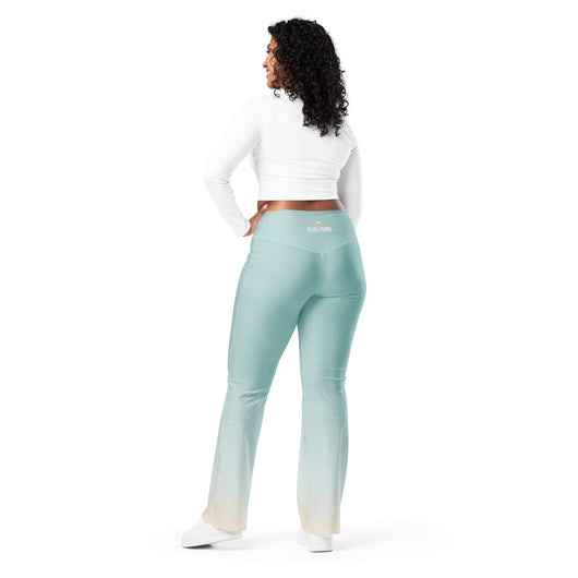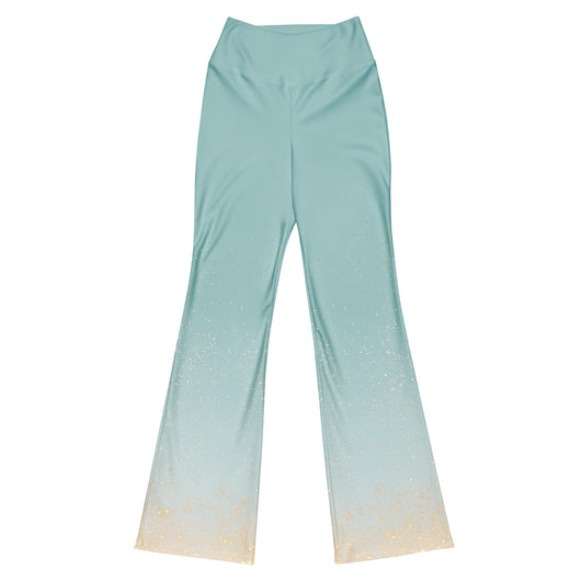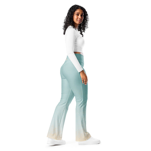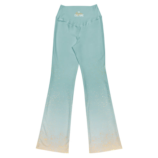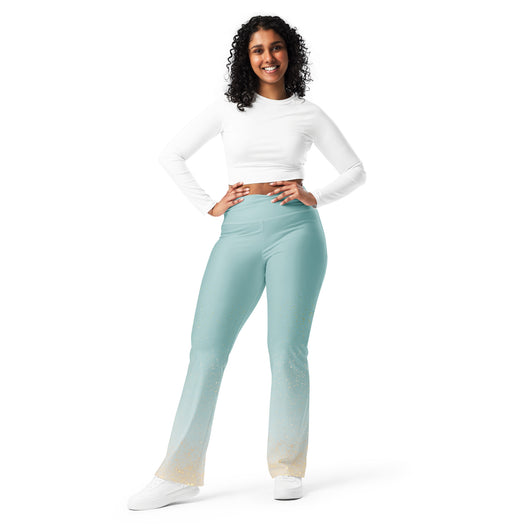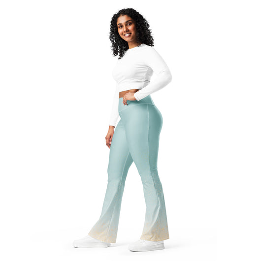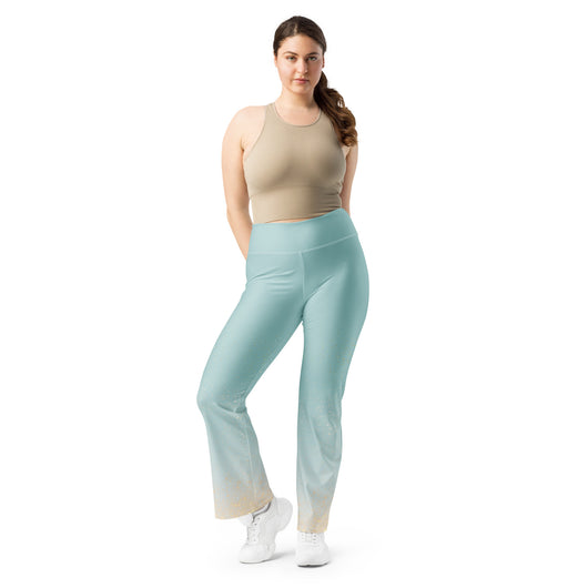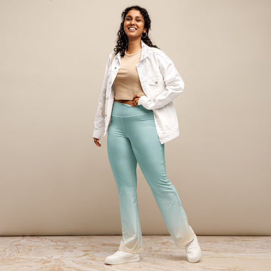 2XS - 6XL | Elevate your activewear with our flare leggings featuring a high waist and butt-lifting cut. Adorned with a gorgeous cyan-green to silver-gold gradient, these trendy yoga leggings combine style and comfort with their flared leg bottoms. Perfect for the gym or casual wear, they’re a must-have addition to any wardrobe.
