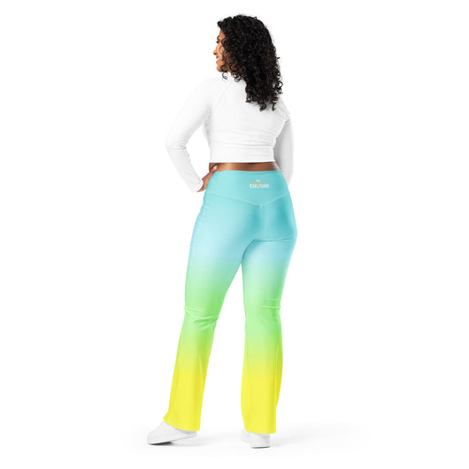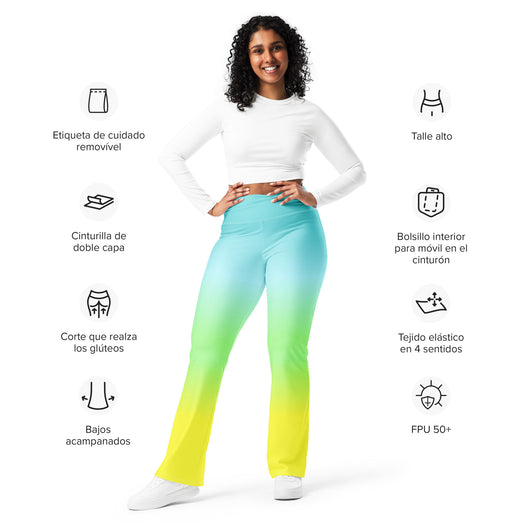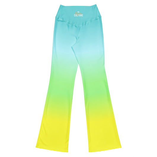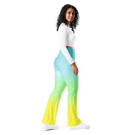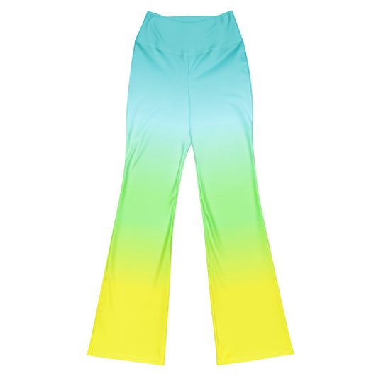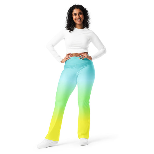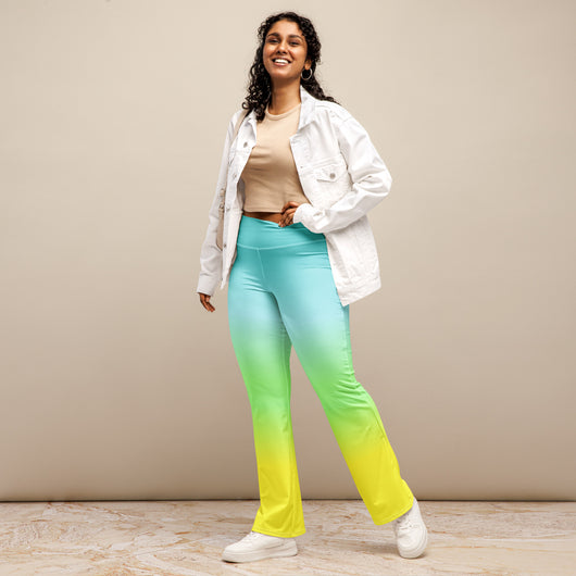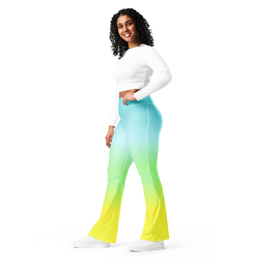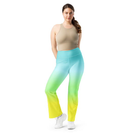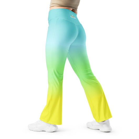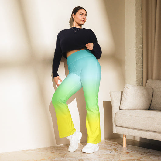 2XS - 6XL | Elevate your activewear with our flare leggings featuring a high waist and butt-lifting cut. Adorned with a gorgeous blue, green and yellow gradients these trendy yoga leggings combine style and comfort with their flared leg bottoms. Perfect for the gym or casual wear, they’re a must-have addition to any wardrobe.