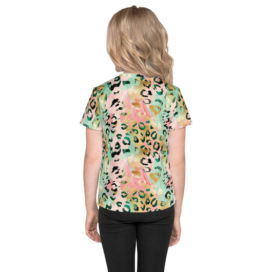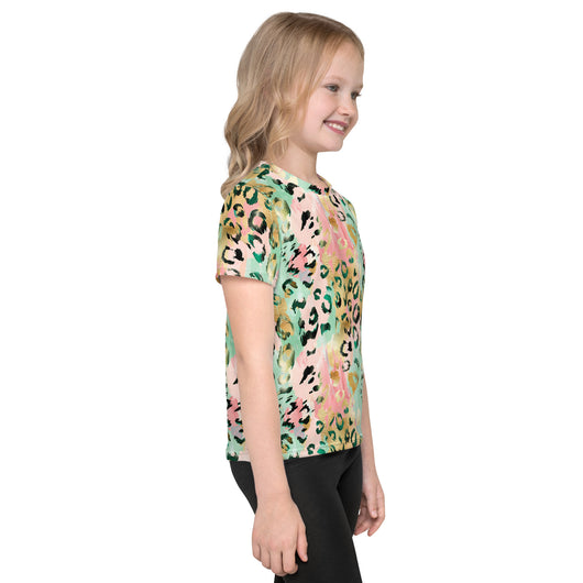 Get your kids ready for back to school with the ultimate kid's crew neck shirt. This tee features a gorgeous wild leopard print in pastel green, pink, and gold. Designed for both style and comfort, it allows your kids to enjoy all their favorite activities while looking great and staying comfy all day.